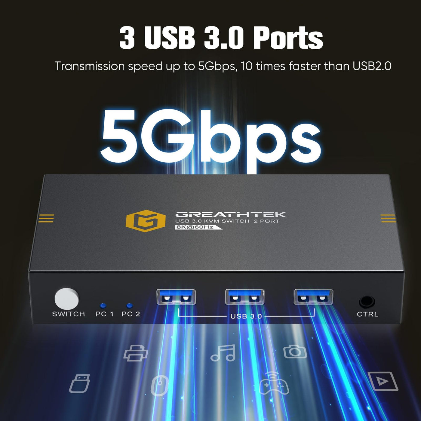 Kvm Switches 2 Port 8K@60Hz, Greathtek Kvm Switch Hdmi Share Usb Devices With 3 Usb3.0 Hubs, 2 Computers 1 Monitor Share Keyboar