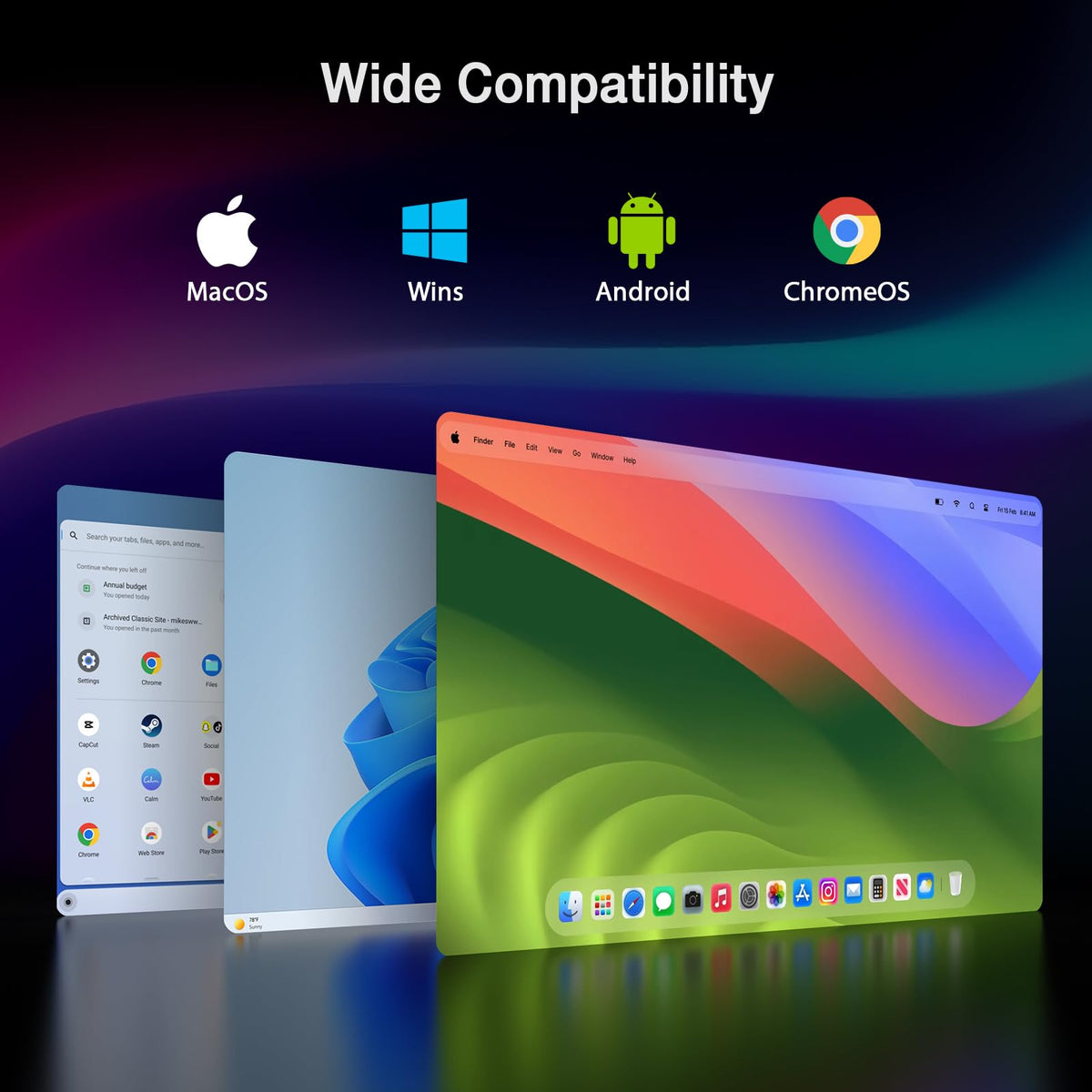 Q: What devices are compatible with the KYY 15.6" Laptop Screen Extender?A: The KYY 15.6" Laptop Screen Extender is compatible with a wide range of devices including Windows laptops, macOS computers, Android devices, and Chrome OS. It connects easily via a full-featured USB-C port or Type-A ports, ensuring a versatile setup.
