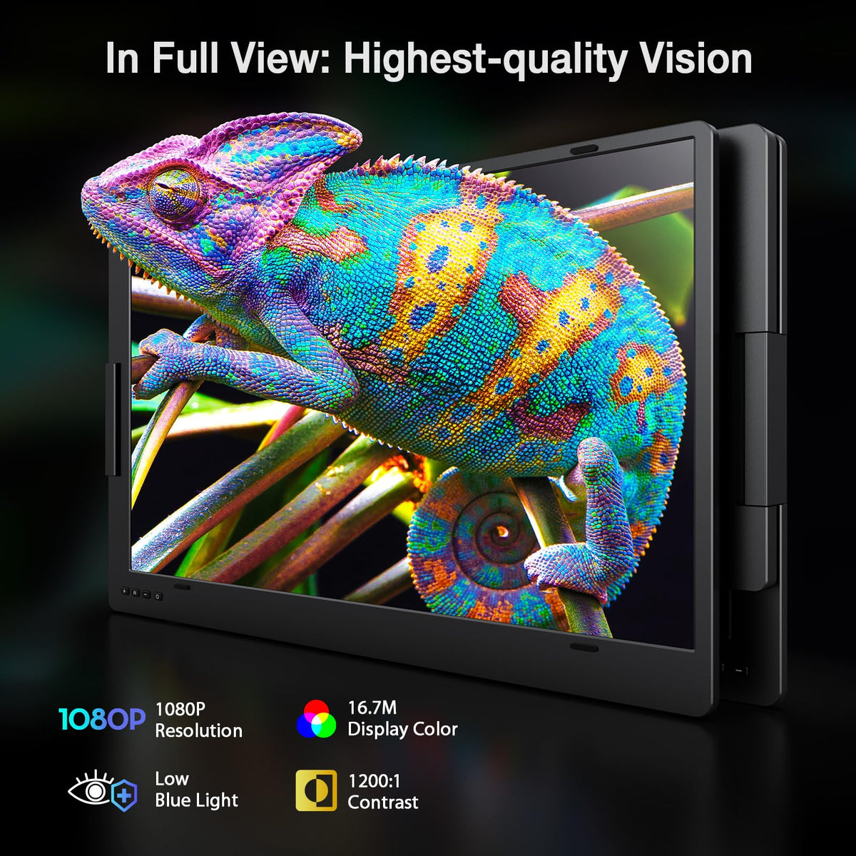 Q: What is the resolution and display quality of the KYY portable monitor?A: The KYY portable monitor boasts a Full HD 1920x1080 resolution with a 1200:1 contrast ratio, offering vibrant colors and clear images. Its IPS display provides a wide 178° viewing angle, making it ideal for screen-sharing, video editing, and gaming.
