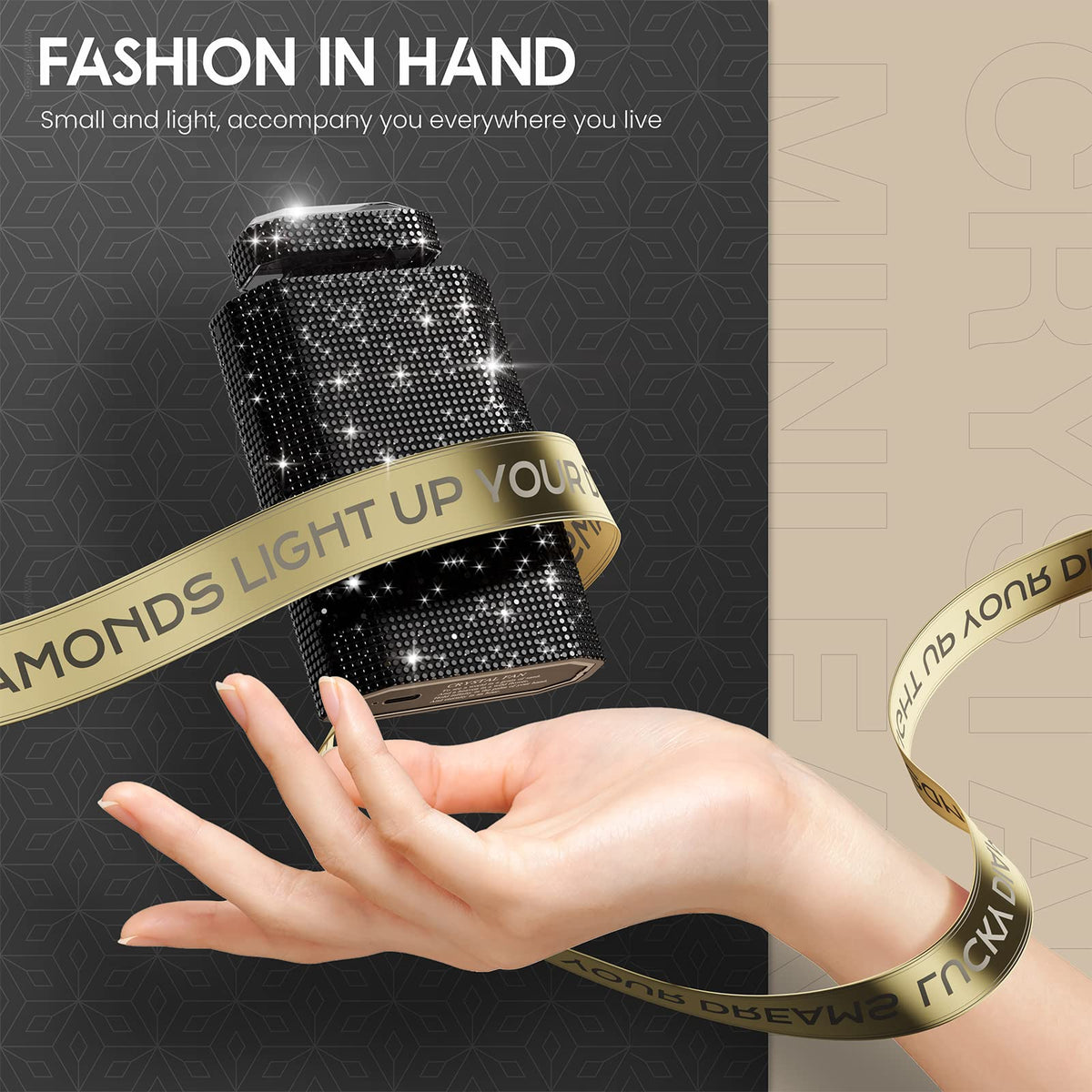 Q: What materials are used in the construction of the Lady Handheld Fan?A: The Lady Handheld Fan features a stylish design with a diamond sticker, while the main material is crystal, giving it an elegant appearance. It also contains a rechargeable lithium-ion battery.