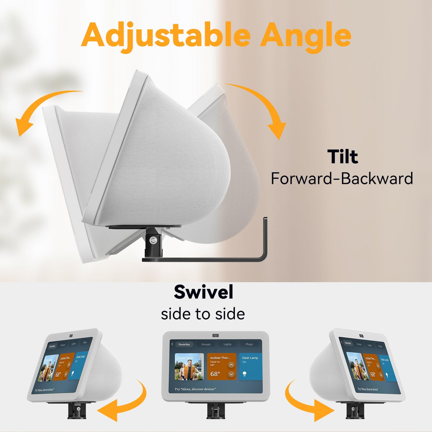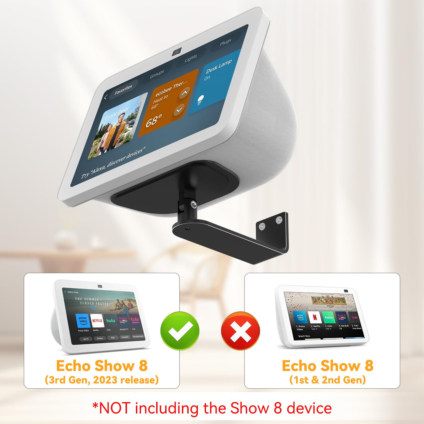 Wall Mount For Echo Show 8 (3Rd Gen) With Magnetic 1.The Mount Is Specifically Designed For The Echo Show 8 (3Rd Gen) And Is Not Compatible With The Echo Show 8 (1St Gen & 2Nd Gen). 2. When Placing The Device, Ensure It Is Aligned With The Bracket'S Groove. 3. When Adjusting The Tilt And Horizontal Swivel Of The Bracket, Ensure That The Bracket Is Stable Enough To Prevent The Device From Shaking Or Tipping Due To Instability. 4. The Echo Show 8 3Rd Gen Wall Mount Is Equipped With Cable Ties That Allow You To Wrap The Excess Cables Around The Bracket For A Neat Appearance 5. Before Installation, Please Check The Wall Surface Type. This Alexa Show 8 Bracket Can Be Mounted On A Single Stud Or A Concrete/Brick Wall. Do Not Install It Into Drywall Alone. 6. Do Not Install The Bracket Upside Down Under A Cabinet. You Have The Option To Purchase An L-Shaped Bracket Or Support Screws To Connect With Our Bracket.