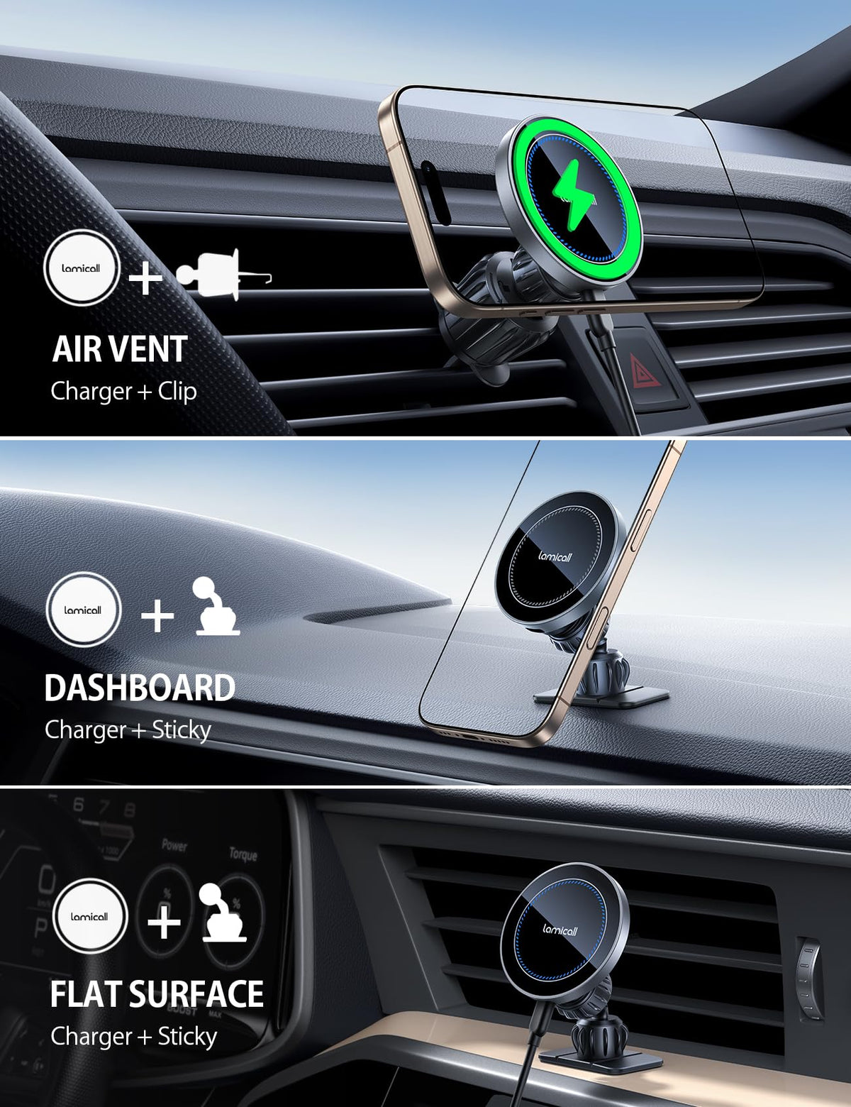 Lamicall 15W Wireless Car Mount Charger - [3-In-1 Upgraded Intelligent Chip] 360 Wireless Car Phone Holder Charger Vent Dashboar