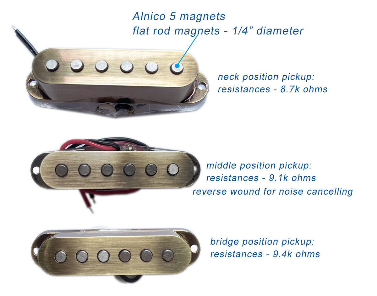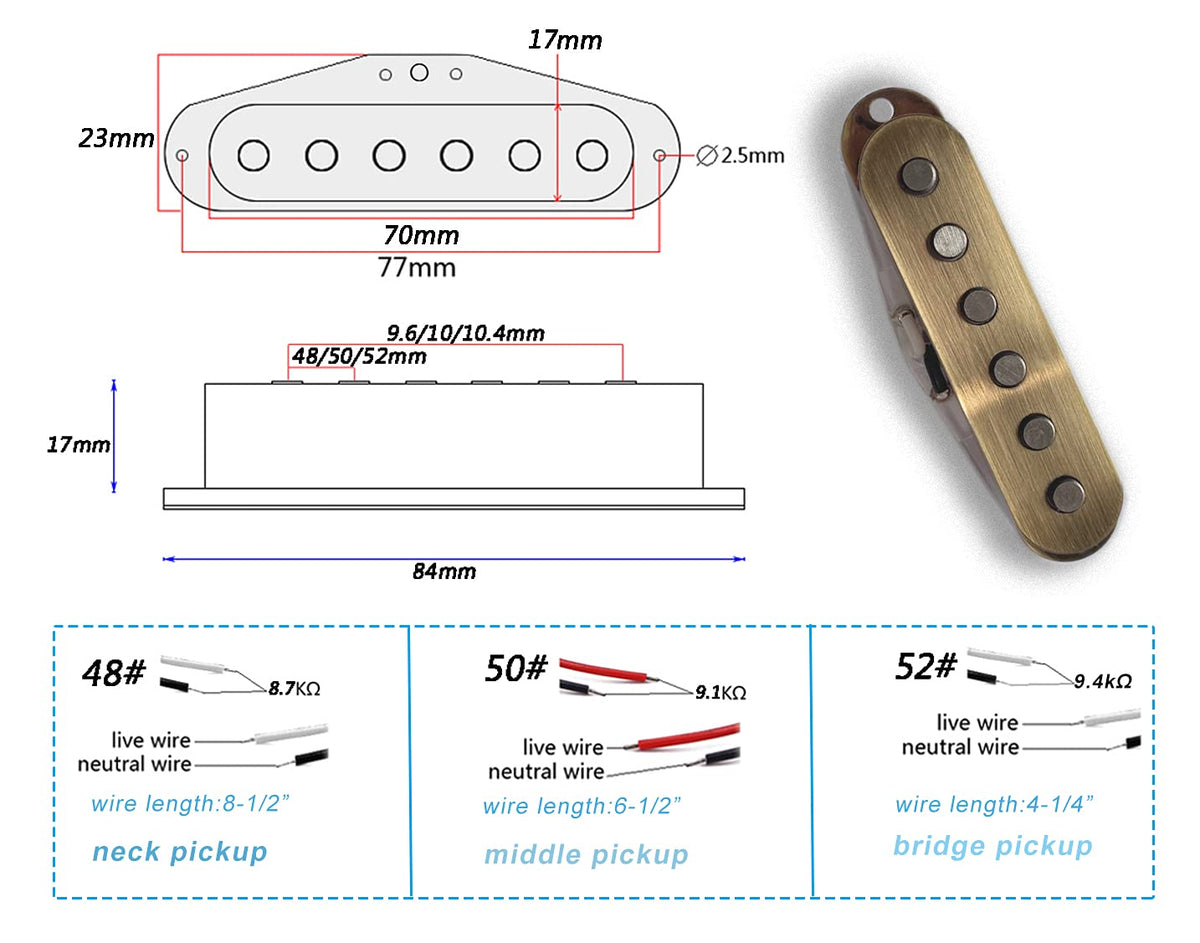 Features: Hand Wound Pickup High Output Cover Of Pickup In Abs Plastic Color :Bronze Color Recommend 250K Pots And A .047Uf Cap For 6 String Electric Guitar Build Neck Pickup R:8.7 Middle Pickup R:9.1 Bridge Pickup R:9.4 Tight Bottom End And Clear Highs Middle Pickup Is Reverse Wound/Reverse Polarity, Delivers A Humcancelling Feature Bridge Pickup Slightly Overwound For More Bite Flatpole Spacing In The Order Of Neck-Middle-Bridge Is 48Mm-50Mm-52Mm Material:&Nbsp; Boutique&Nbsp; Alnico 5 Magnets , Vintage Style Cloth Wire, Paraffin, Enamelled Copper Wire Single Core Copper Wire Package: 1 X Neck Pick Up 1 X Middle Pup 1 X Bridge P/U 6 X Mounting Screws And Springs Packed Into A Sturdy Box