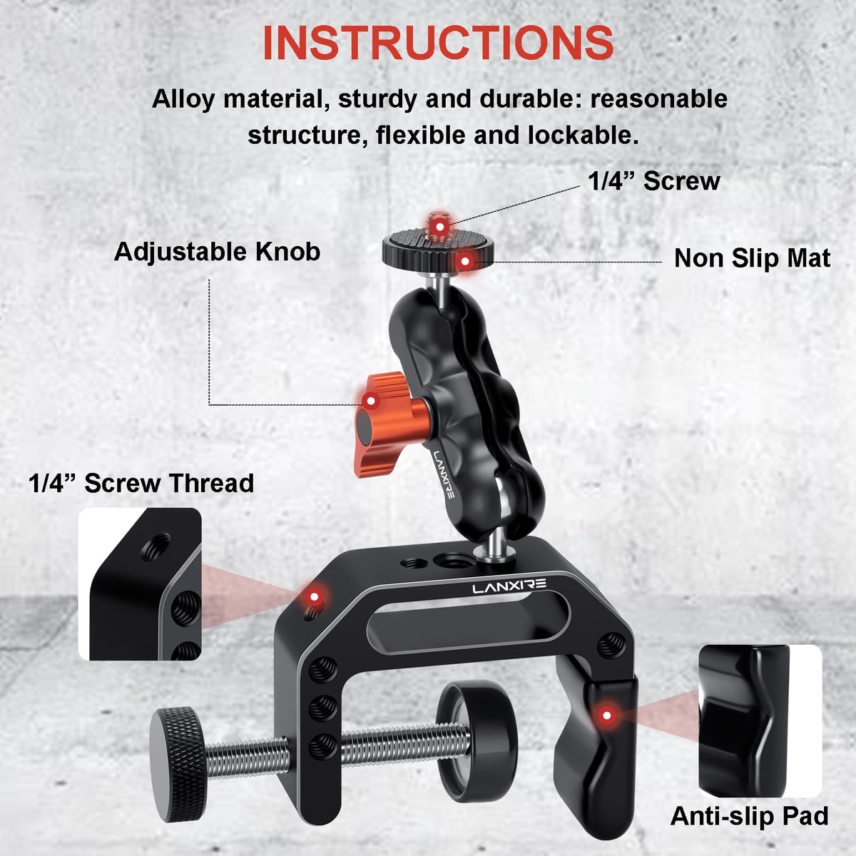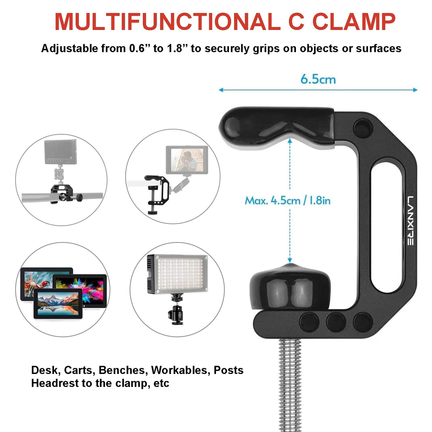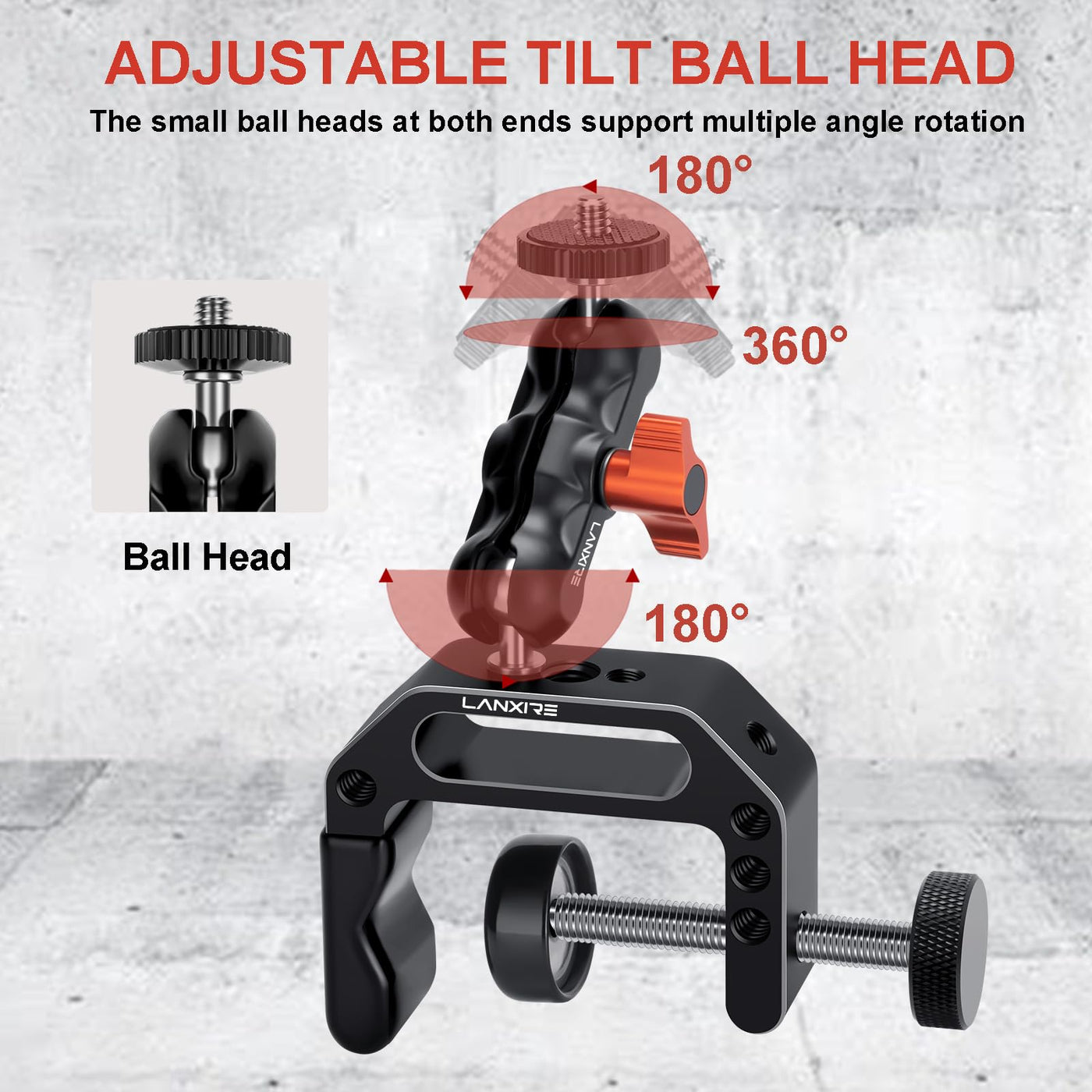Product Feature: 1. C Clamp With Double Ball Head With 1/4 Screw Is A Functional Tool For Your Daily Life. It Is Also Designed For The Photography Video Shooting. The Camera Mount Also Suits Your Diy Need, Such As Vlog, Youtube, Tiktok. 2. Multifunctional Double Ball Head With 1/4'' Screw, Perfect For Photographic Accessories Like Lcd Filed Monitor, Flash, Led Lights, Microphone, Cam Camera Or Other Etc. You Can Loosen And Tightens The 360 Ballhead Easily To Help You Find The Best Shooting Angle Anywhere. 3. C Clamps And Multifunctional Double Ball Head Is Made Of High Quality Aluminum Alloy And Stainless Steel. It Is Very Durable And Lightweight. The Sets Net Weight Is Only 200G, You Can Easy To Carry It Anywhere Anytime. 4. The Maximum Load Is 3.5Kg. The Clamps Max Jaw Opening Is 45Mm And The Min Jaw Opening Is 5Mm. You Can Clip Is On Less Than 55Mm Thick Thing 25Mm Rod And 30Mm Rods, Plate, Bicycle Handles, Cross Bar, Table, Shelves Or Other Etc. 5. The Universal C Clamps Attaches To Desks, Carts, Benches, Worktables, Metalwork, Woodwork, Stages, Studios, Broadcasting And Even Photography. It Is Ideal Accessories For Various Projects Inside And Outside The House. Product Specifications: Brand: Lanxire Color: Black Material: Aluminum Alloy, Stainless Steel Package Lists: 1 X C Clamp 1 X Ball Head Adapter