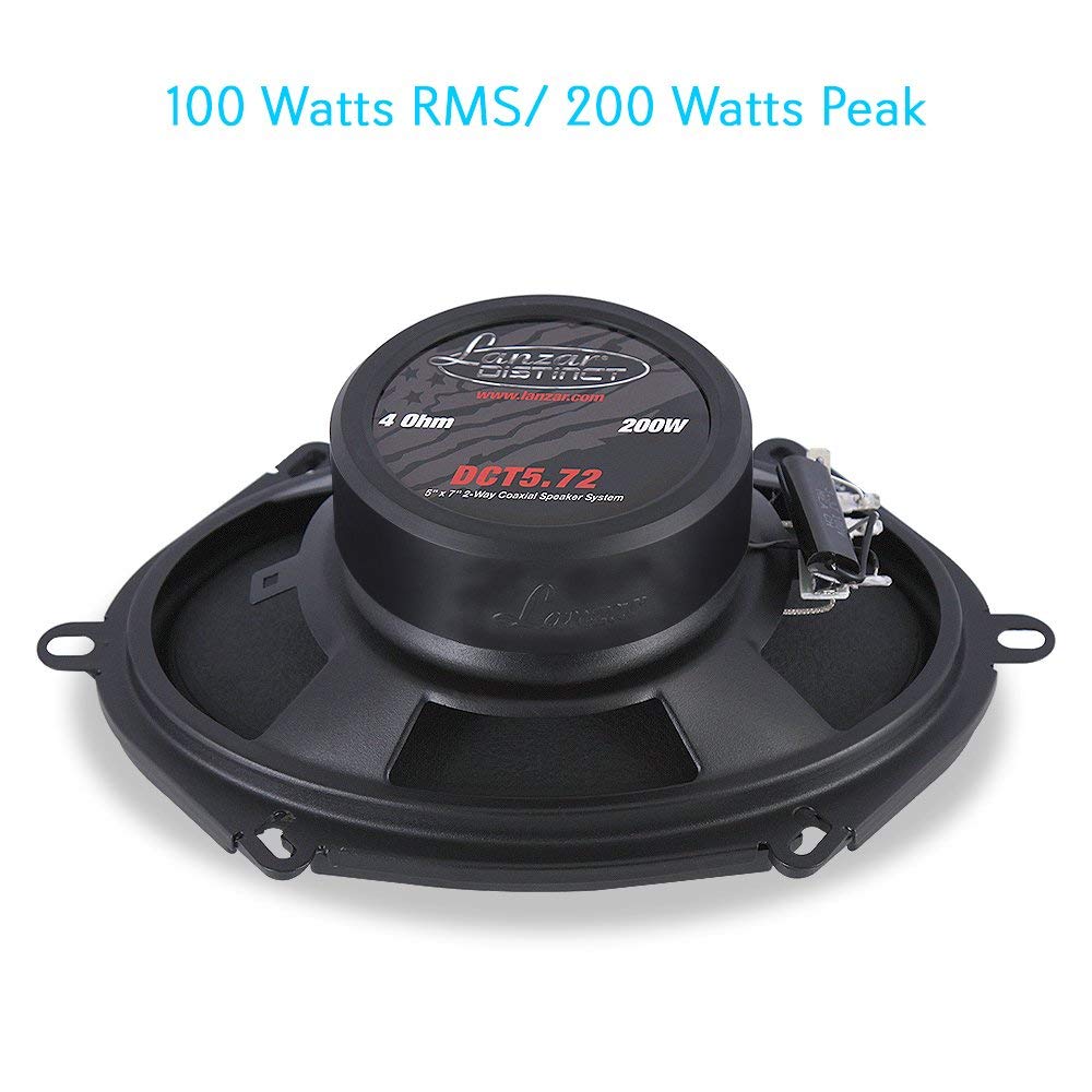 Lanzar 'Distinct Series' Model: Dct5.72Pro Audio 5 X 7 / 6 X 8 In Car Speakers5'' X 7'' / 6'' X 8'' -In Car Stereo Speaker Pair - Universal Oem Replacement 2-Way Pro Audio Component Speakers (200 Watt Max)Features: Standard 5''X 7'' / 6'' X 8'' Car Speaker Size 2-Way Coaxial Full Range Stereo Sound Universal Oem Quick Replacement Speakers Lab Tested Pro Audio Sound Performance Vehicle Door & Side Panel Mount Compatible Neo Silk-Dome Tweeters Treated-Coat Paper Speaker Cones High Temperature Aluminum Voice Coils Non-Fatiguing Butyl Rubber Surround Reinforced Rubber Magnet Boot Rugged Detachable Metal Speaker Grills Universal Vehicle Compatibility For Cars & Truckswhats In The Box: (2) 5 X 7 / 6 X 8 -Inch Speakers (2) Speaker Grill Covers Speaker Connection Cablestechnical Specs: Power Output: 200 Watt Max / 100 Watt Component Speaker Type: 2-Way, Coaxial Voice Coil: 1.0 -Inch Aluminum High-Temp Tweeter: 1.0'' -Inch Pei Dome Impedance: 4 Ohm Frequency Response: 65-20 Khz Magnet: 20 Oz Structure Mounting Depth: 2.48 -Inchesthe Lanzar Distinct Series Component Car Speakers Provide Lab Tested, High-Powered Audio Performance. Coaxial 2-Way Full Range Stereo Reproduction Adds Another Dimension Of Sound To Your Vehicles Stereo System. Universal Standard Oem Size Compatibility Allows For Quick Plug-And-Play Installation -- Or Works Perfect As Replacements For A Blown-Out Speakers For Any Car Or Truck. Rugged Speaker Housing Construction With Detachable Metal Grills Add Sleek Style Along With Powerful Sound To Your Vehicles Interior. The Distinct Series Speaker Pair Feature High-Temperature Aluminum Voice Coils, Neo Silk-Dome Tweeters, Butyl Rubber Surround And Reinforced Magnet Boots, All Designed For Long Lasting Audio On The Road. Add Pro Sound Power To Your Car Stereo System With Lanzars Distinct Series 5 X 7 / 6 X 8 -Inch Component Speakers.