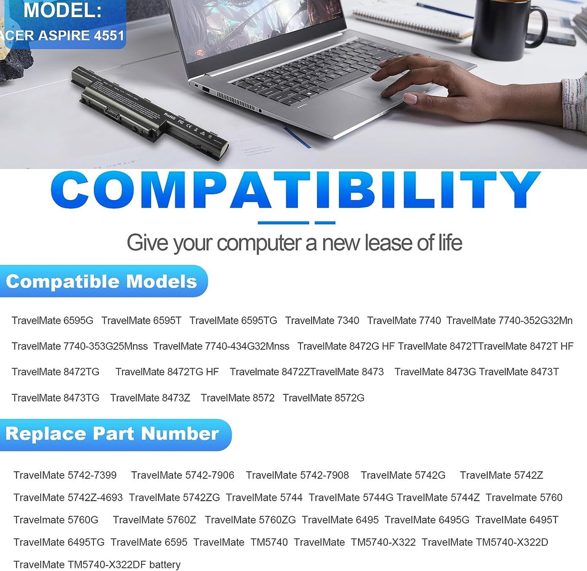 Q: Which Acer laptop models are compatible with this battery replacement?A: This laptop battery replacement is compatible with a wide range of Acer models including the Aspire Series 4250, 4253, 4339, 4349, and many others. A complete list of compatible models can be found in the product description.