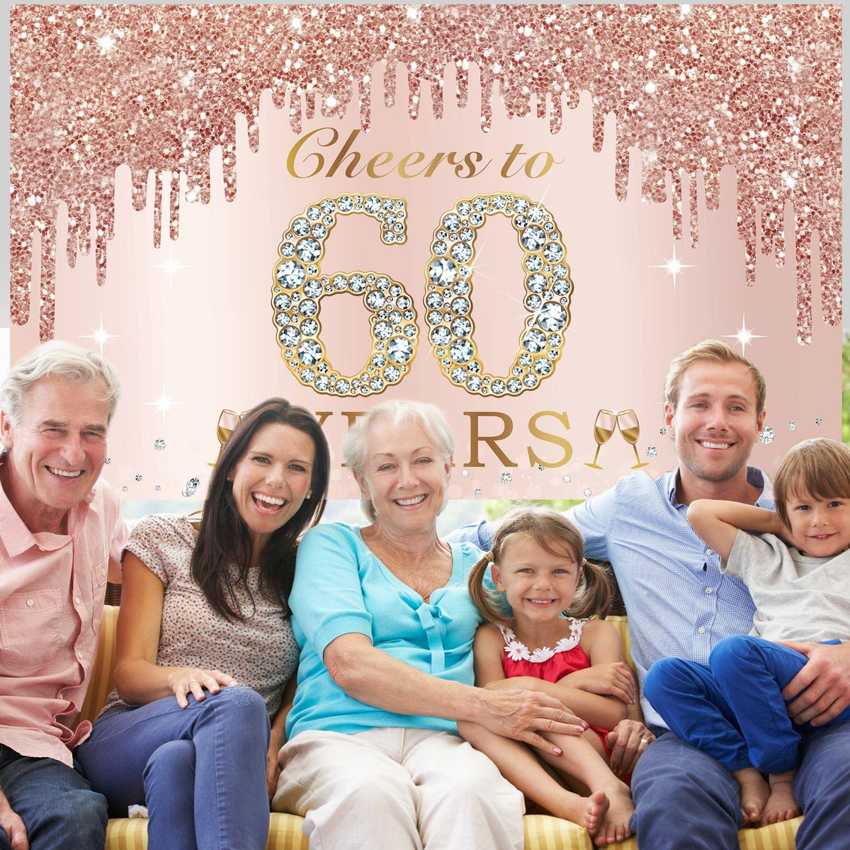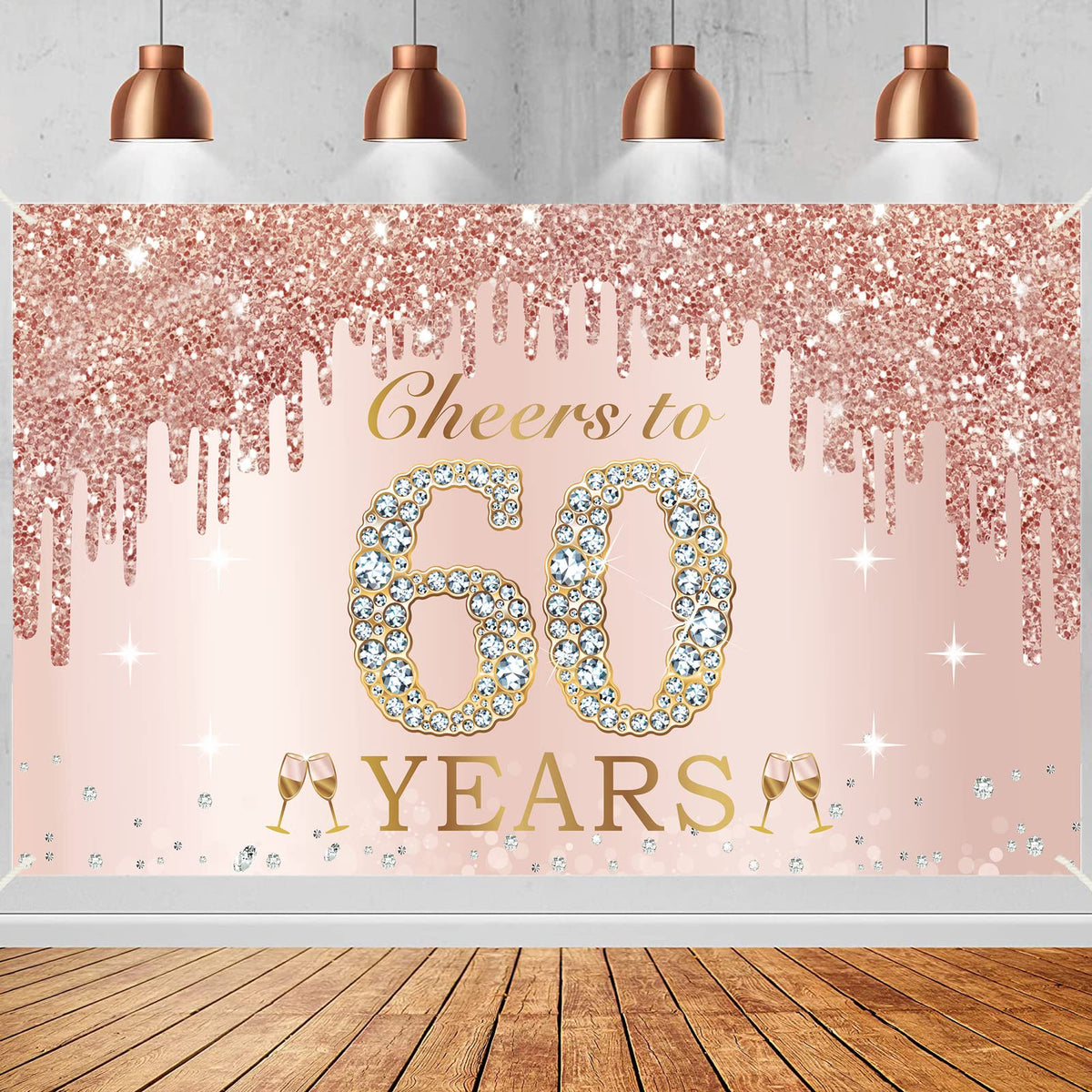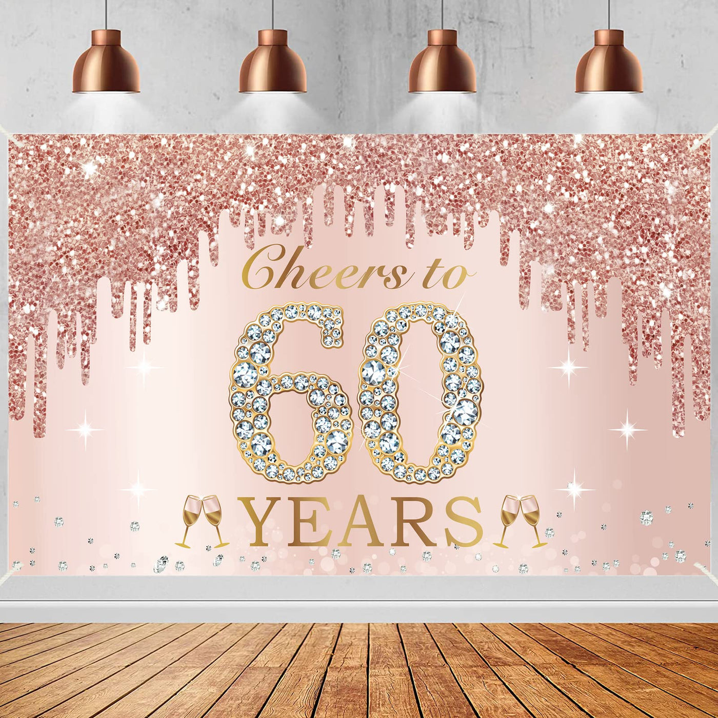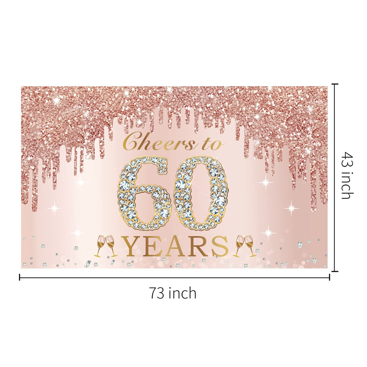 Large Cheers To 60 Years Birthday Decorations For Women, Pink Rose Gold Happy 60Th Birthday Banner Backdrop Party Supplies, Sixt