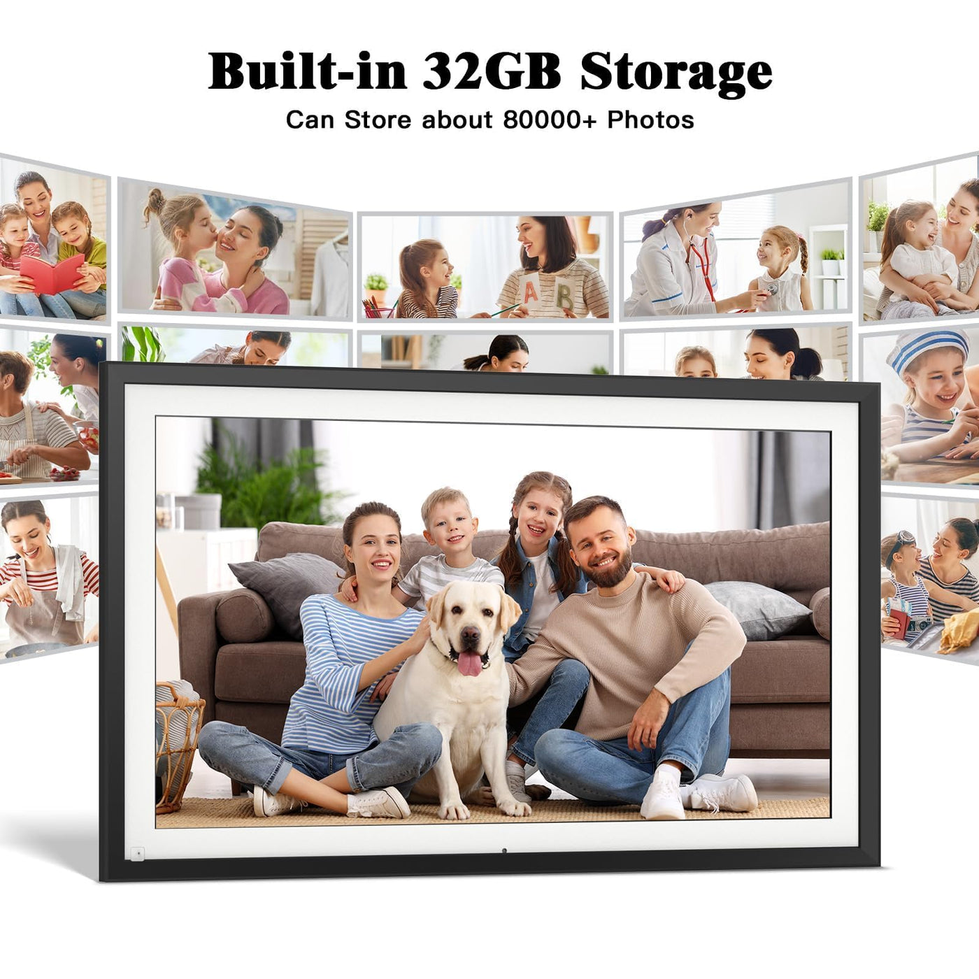 Q: What storage capacity does the digital frame have?A: This digital picture frame comes with a substantial 32GB built-in storage capacity, allowing you to store over 80,000 photos. Additionally, it supports SD cards (up to 64GB) and USB for extended storage options.