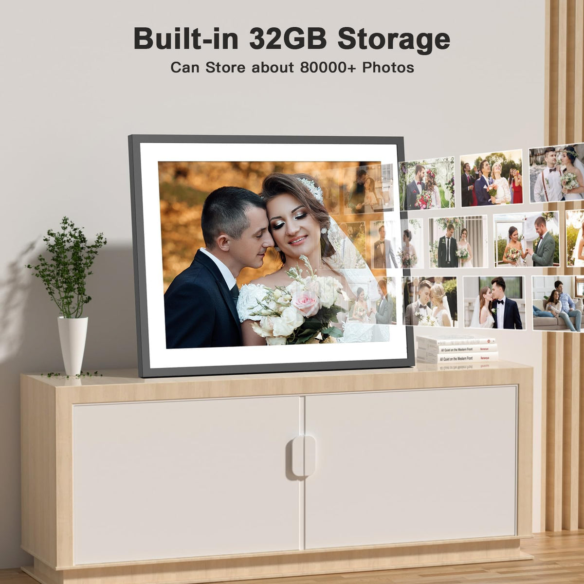 Q: What is the storage capacity of the digital picture frame?A: The digital picture frame comes with 32GB of internal storage, capable of holding over 40,000 pictures. Additionally, it supports Micro TF cards and USB drives for expandable storage up to 64GB.