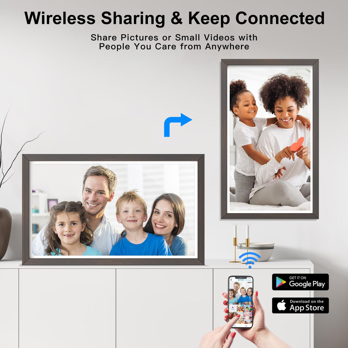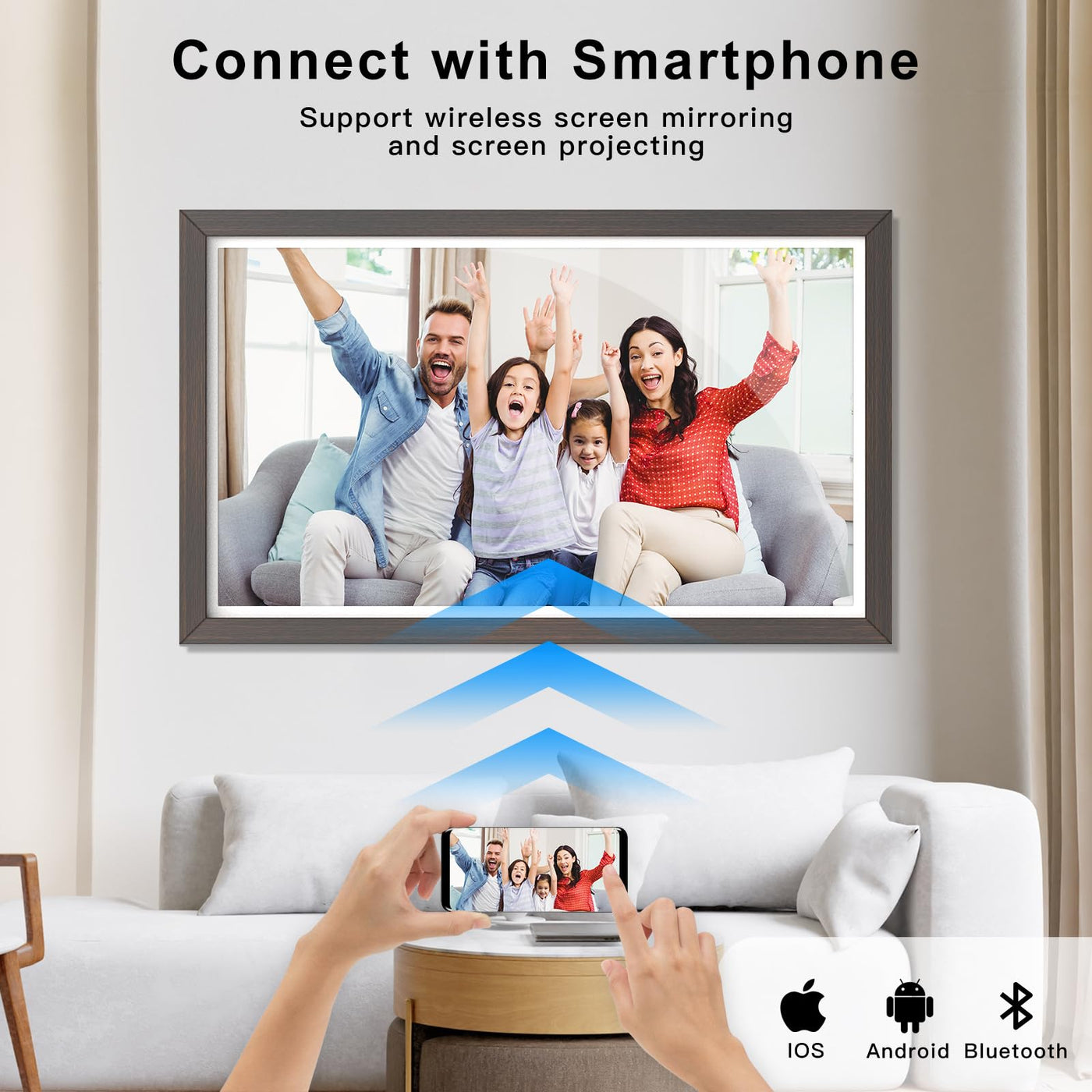 Q: What are the connectivity options for the Large Digital Picture Frame?A: The Large Digital Picture Frame offers fast dual WiFi connectivity, supporting both 2.4 GHz and 5GHz networks. This allows for quick sharing of photos and videos from your smartphone or tablet using the 'Vphoto' app available for both iOS and Android devices.