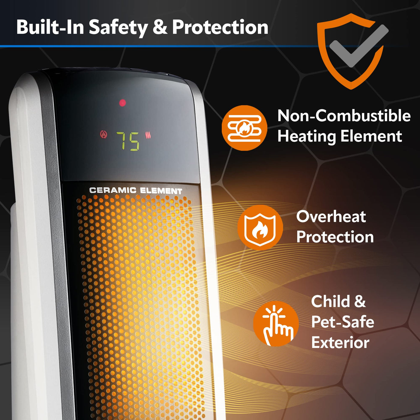 Laskos Ceramic Tower Heater Features A Programmable Thermostat With An 8-Hour Timer. It Has An Elongated Heating Element, Widespread Oscillation, And Penetrating Air Velocity Push To Warmth Throughout The Room. Its Safety Features Include Self-Regulating Ceramic Element, Overheat Protection And Cool-Touch Housing. This Space Heater Is An Excellent Choice For Heating Your Living Room, Bedroom And More. 3-Year Limited Warranty.