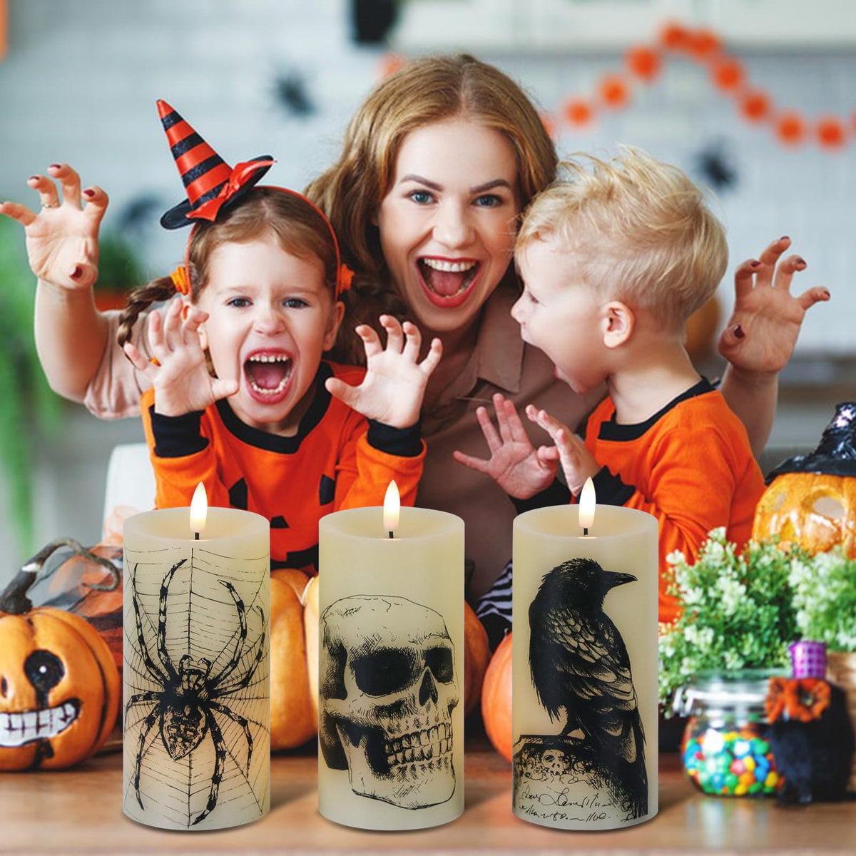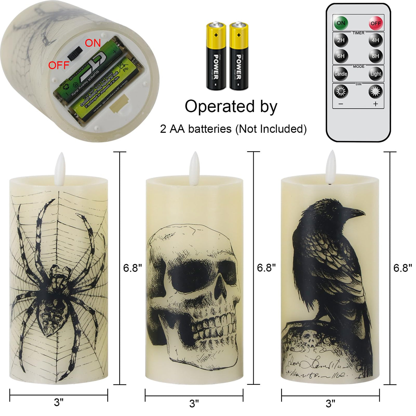 Lasumora Halloween Flameless Pillar Candles With Remote Timer - Skull, Spider Web, Crow Raven Decals Set Of 3, Battery Operated Halloween Decor Led Candles Horror Gothic Punk Decoration Real Wax