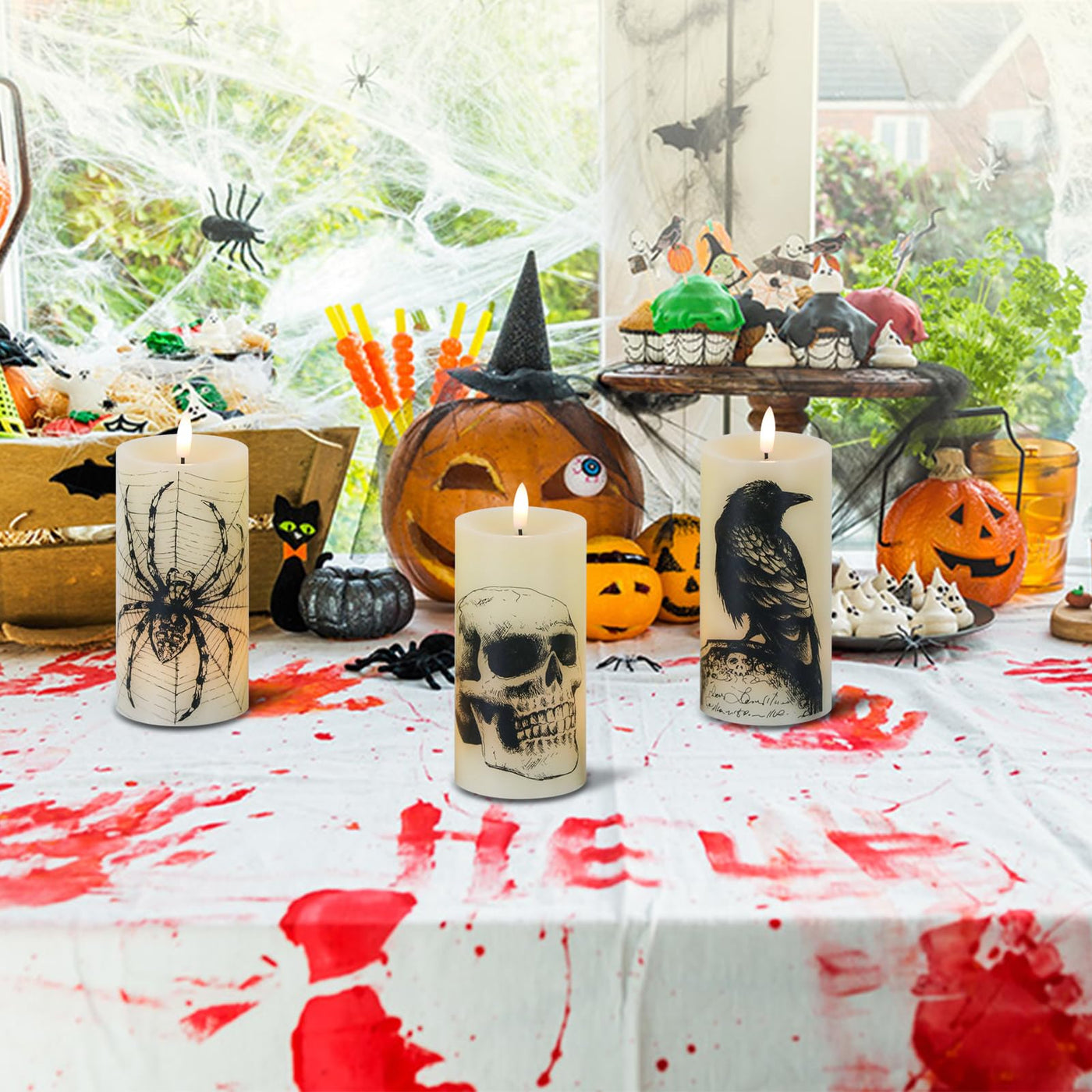 Lasumora Halloween Flameless Pillar Candles With Remote Timer Skull, Spider Web, Crow Raven Decals Set Of 3, Battery Operated