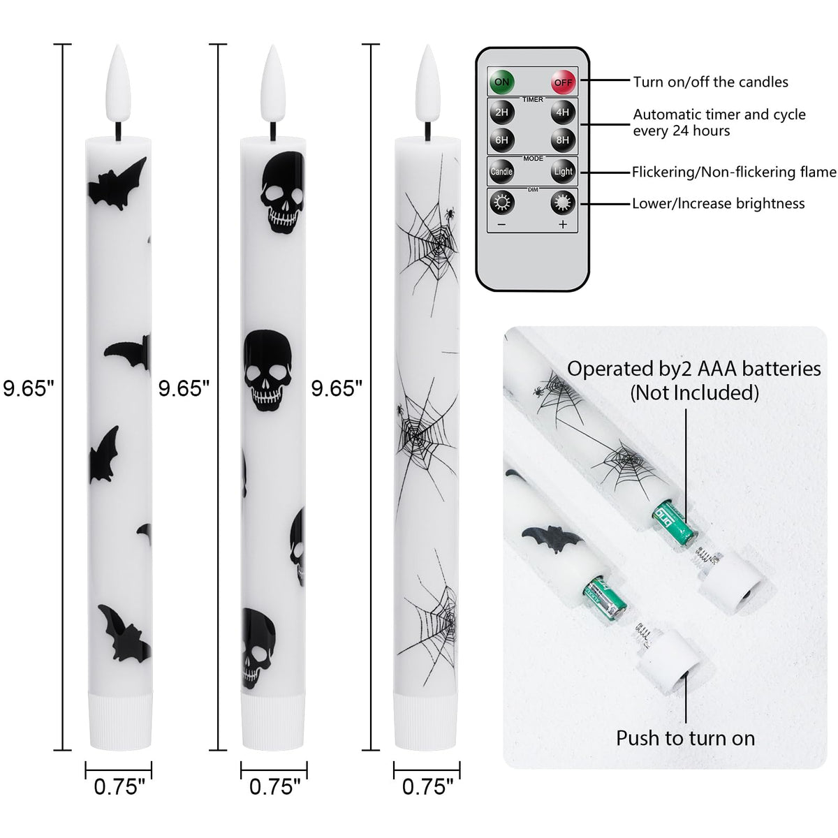 Lasumora Halloween Flameless Taper Candles With Remote Timer, 6 Pack Led Flickering Candlestick, Battery Operated Real Wax Candles With Bat, Skull And Spider Web Prints For Halloween Decorations