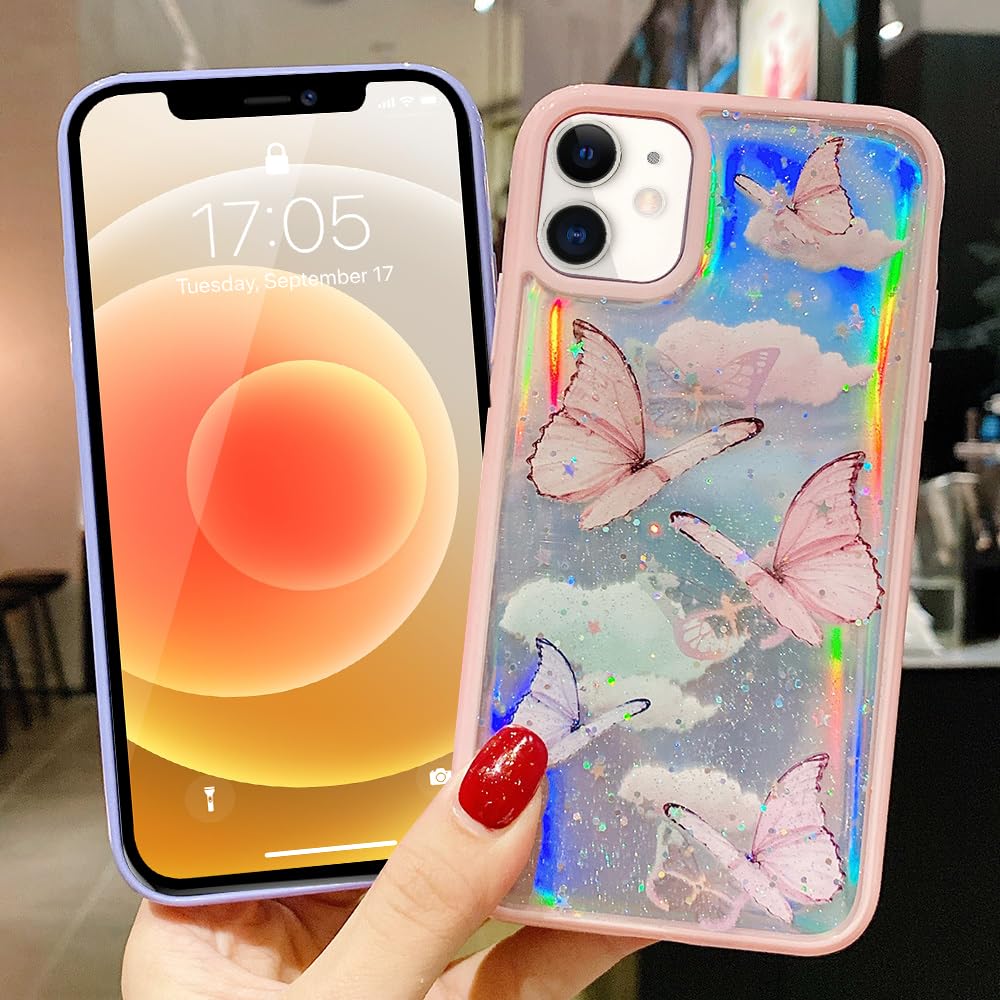 Lchulle Girly Case Compatible With Iphone 12/Iphone 12 Pro Case Cute Iridescent Butterfly Design Laser Bling Glitter Stars Girls