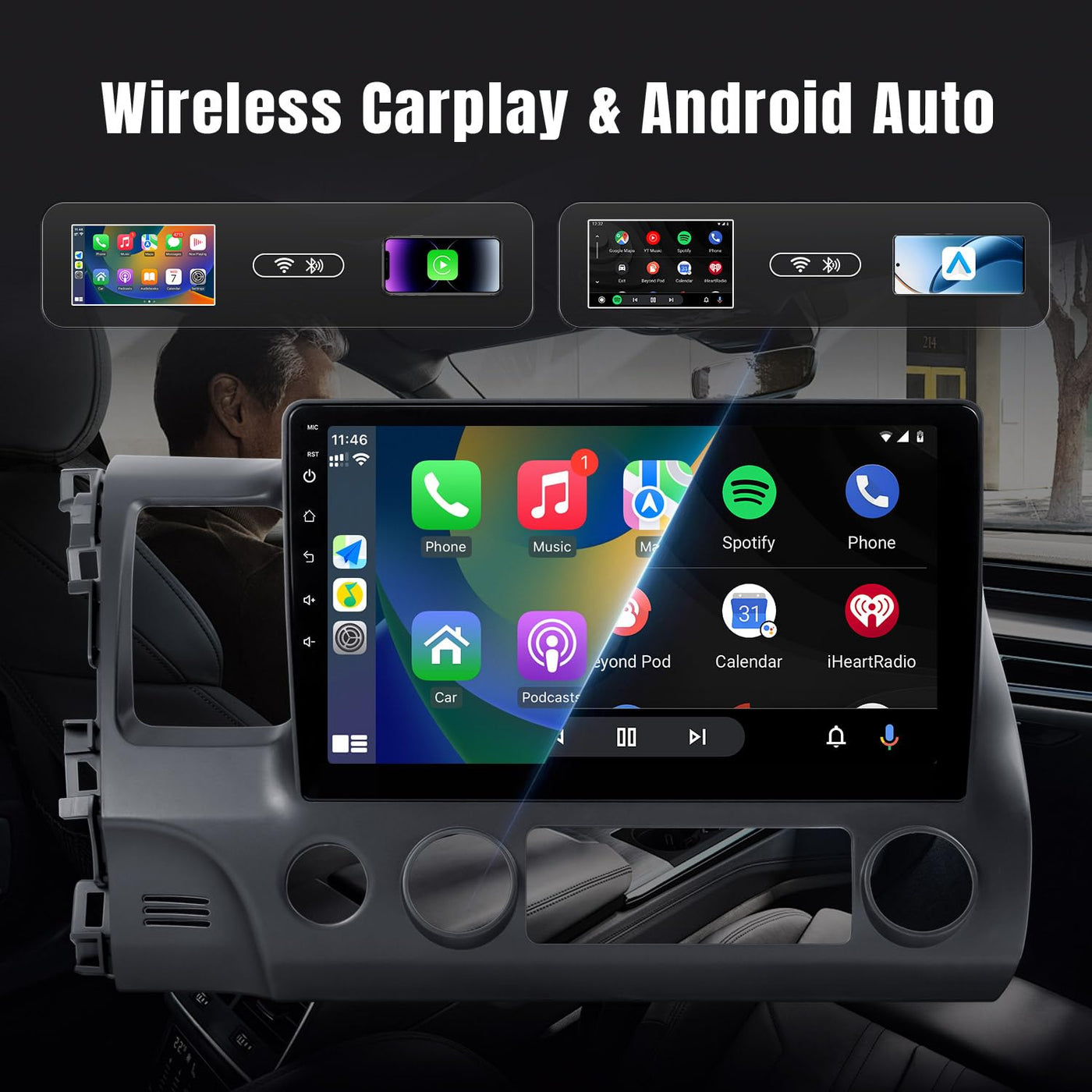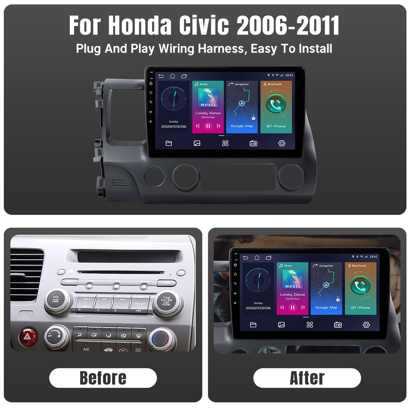 Vehicle Compatibility:Honda Civic 2006Honda Civic&Nbsp;2007 &Nbsp; &Nbsp; &Nbsp; &Nbsp; &Nbsp; &Nbsp;Honda Civic&Nbsp;2008 &Nbsp; &Nbsp; &Nbsp; &Nbsp; &Nbsp; &Nbsp; &Nbsp; &Nbsp; Honda Civic&Nbsp;2009 &Nbsp; &Nbsp; &Nbsp; &Nbsp; &Nbsp; &Nbsp; &Nbsp; &Nbsp; &Nbsp; &Nbsp; &Nbsp; &Nbsp; Honda Civic&Nbsp;2010 Honda Civic&Nbsp;2011 &Nbsp; &Nbsp; &Nbsp; &Nbsp; Note: Do Not Support J-B-L.Features :&Nbsp; System: Android 12 System Memory: 2Gb Ram + 32Gb Rom&Nbsp; &Nbsp; &Nbsp;&Nbsp; Screen Size: 10.1 Inch Ips Touchscreen&Nbsp; &Nbsp;&Nbsp; Resolution: 1024*600, 1080P Built-In: Wireless Apple Carplay &Amp; Android Auto; Buletooth 5.1; Wifi; Gps Navigation More Functions: Support Split Screen, Mirror Link, Buletooth Hands-Free Calling And Music, Fm Radio With Unlimited Preset Stations, Backup Camera (Included), Steerling Wheel Control, Etc.