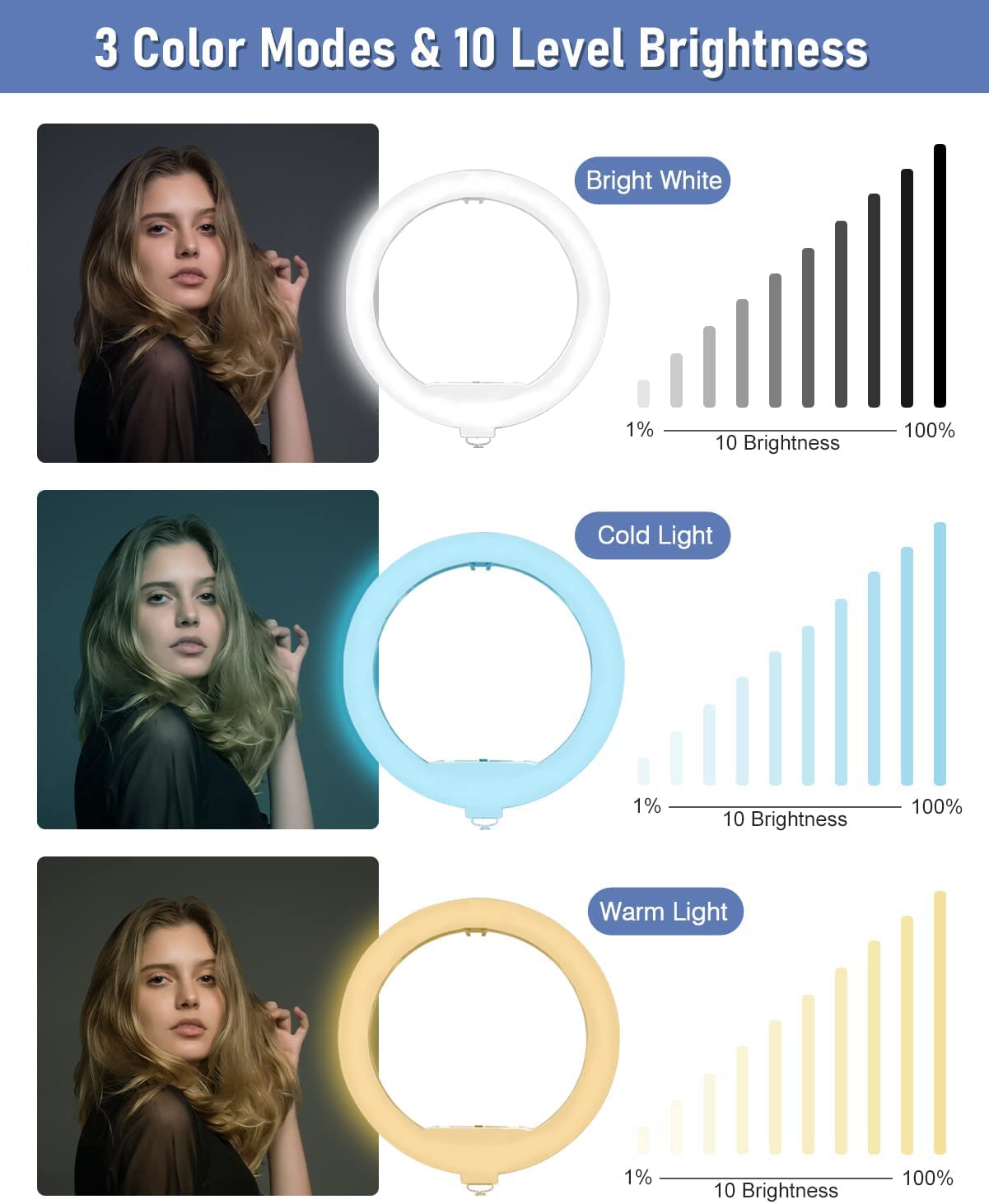 Q: What are the different lighting modes available in the LED Ring Light?A: The LED Ring Light features three color lighting modes: cold white, warm yellow, and warm white. Each mode has 10 adjustable brightness settings, allowing you to customize the lighting to suit your needs.