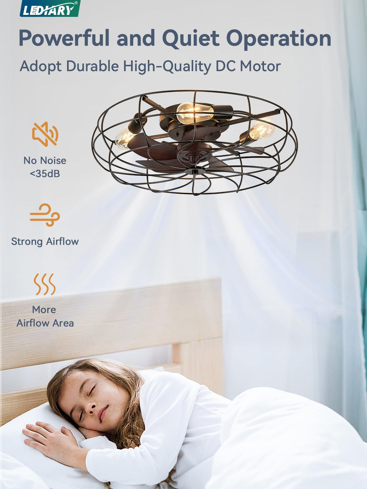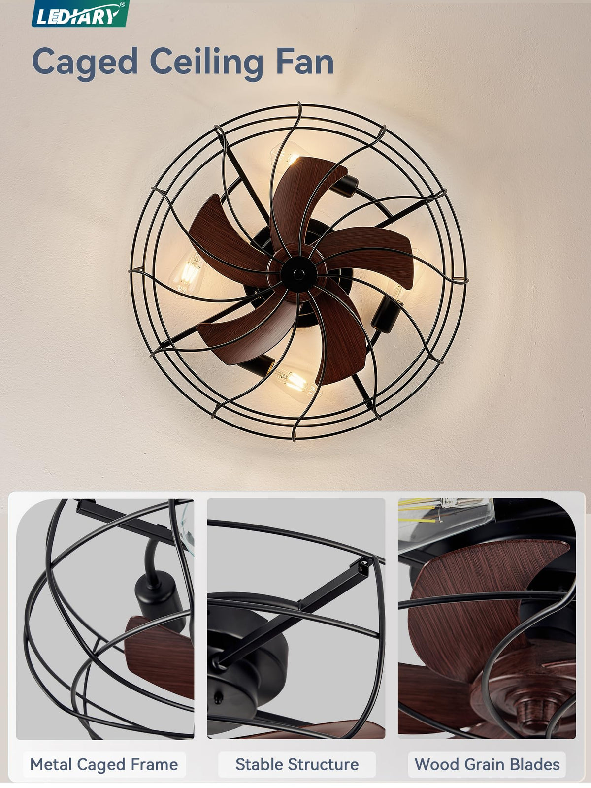 Lediary 23 Inch Caged Ceiling Fans With Lights Have 6 Speed Setting And 1H/2H/4H Timer Setting. Equiped With Powerful, Quiet And Comfortable Motor, It'S Energy Saving, Easy Installation And Space-Saving. You Can Install The Modern Flush Mount Ceiling Fan In The Bedroom, Living Room , Kitchen, Office. A Combination Of Industrial And Rustic Styles, It'S Also A Great Decoration.
