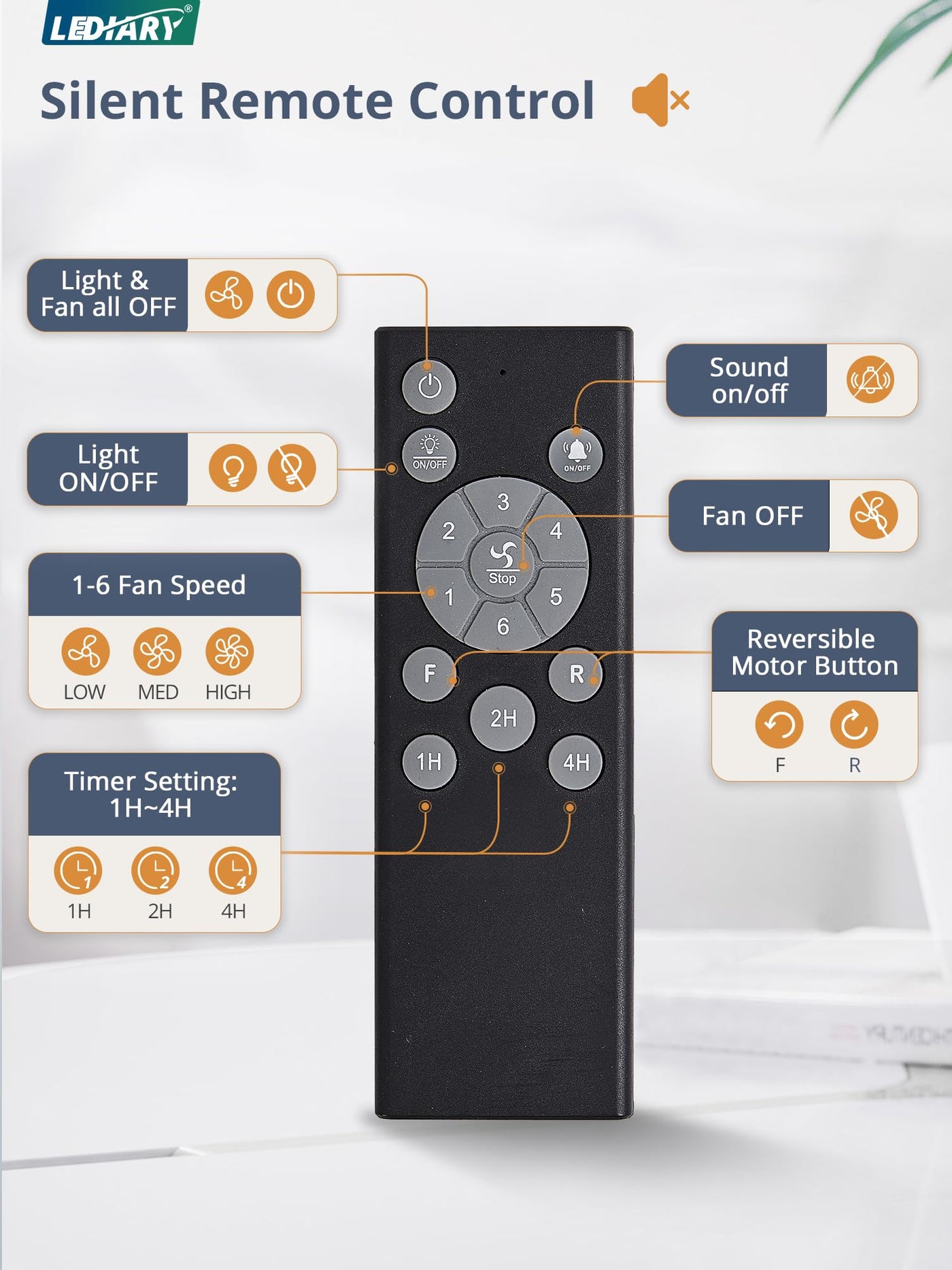 Q: What features does the LEDIARY ceiling fan offer?A: The fan includes six wind speeds, a reversible mode, a timer function, and a natural breeze mode for customized comfort.