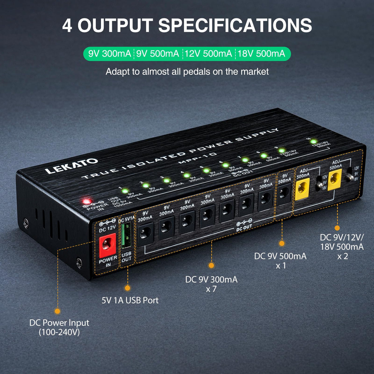 ??[Clean And Quiet Supply] Unlike Common Daisy Chains, Lekato Guitar Pedal Power Supply Is Truly Isolated. With Multiple Transformers, It Can Deliver Stable, Clean And Quiet Power To Your Pedals. Noise Free, Clean Power With Zero Headaches. | ??[Short Circuit Protection] This Pedal Power Supply Has 10 Isolated Outputs, And Each Channel Has Separate Short-Circuit And Over-Current Protection. A Short Circuit In One Port Will Not Affect Other Ports Working. | ??[Adjustable Voltage] Of Ten Isolated Ports, We Set Up Two Special Ports That The Voltages Of Them Can Be Changed ( Dc 9V 12V 18V) To Cater To Different Pedals. | ??[Usb Port And 10 Isolated Ports] In Addition To 10 Isolated Outports, It Comes With A Usb Port To Charge Your Phone. The Specifications Of 10 Ports Are As Followed: 9V 300Ma Port X 7, 9V 500Ma Port X 1, Adjustable Output (9/12/18V) 500Ma Adjustable Port X 2 | ??[Heavy-Duty And Reliable] The Pedal Power Supply Is Made From Superior Aluminum Alloy, Which Is Heavy-Duty And Excellent In Heat Radiation. Each Output Has An Led Indicator. The Light Will Be On When The Pedal Cable Is Connected, Otherwise, There Is A Short Circuit