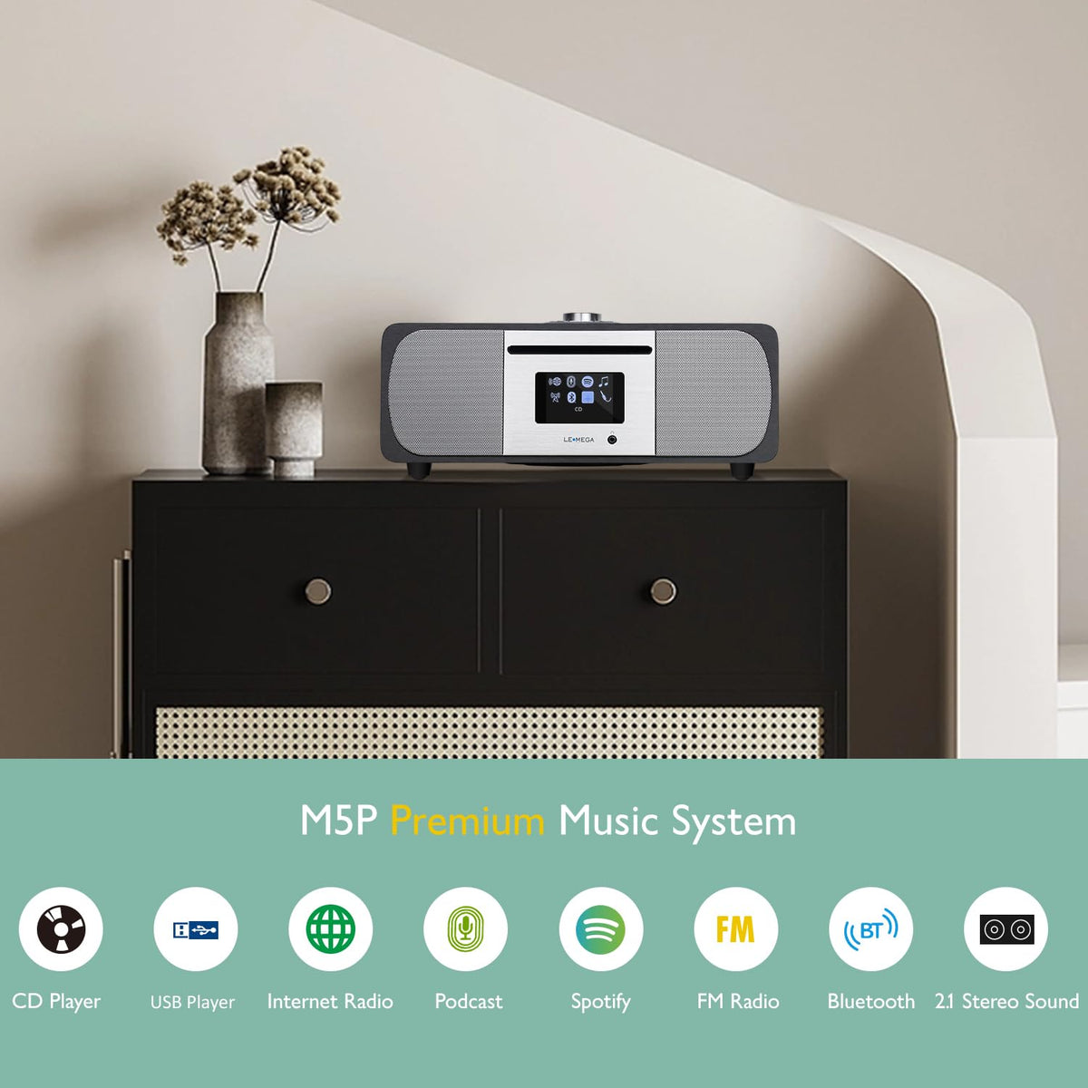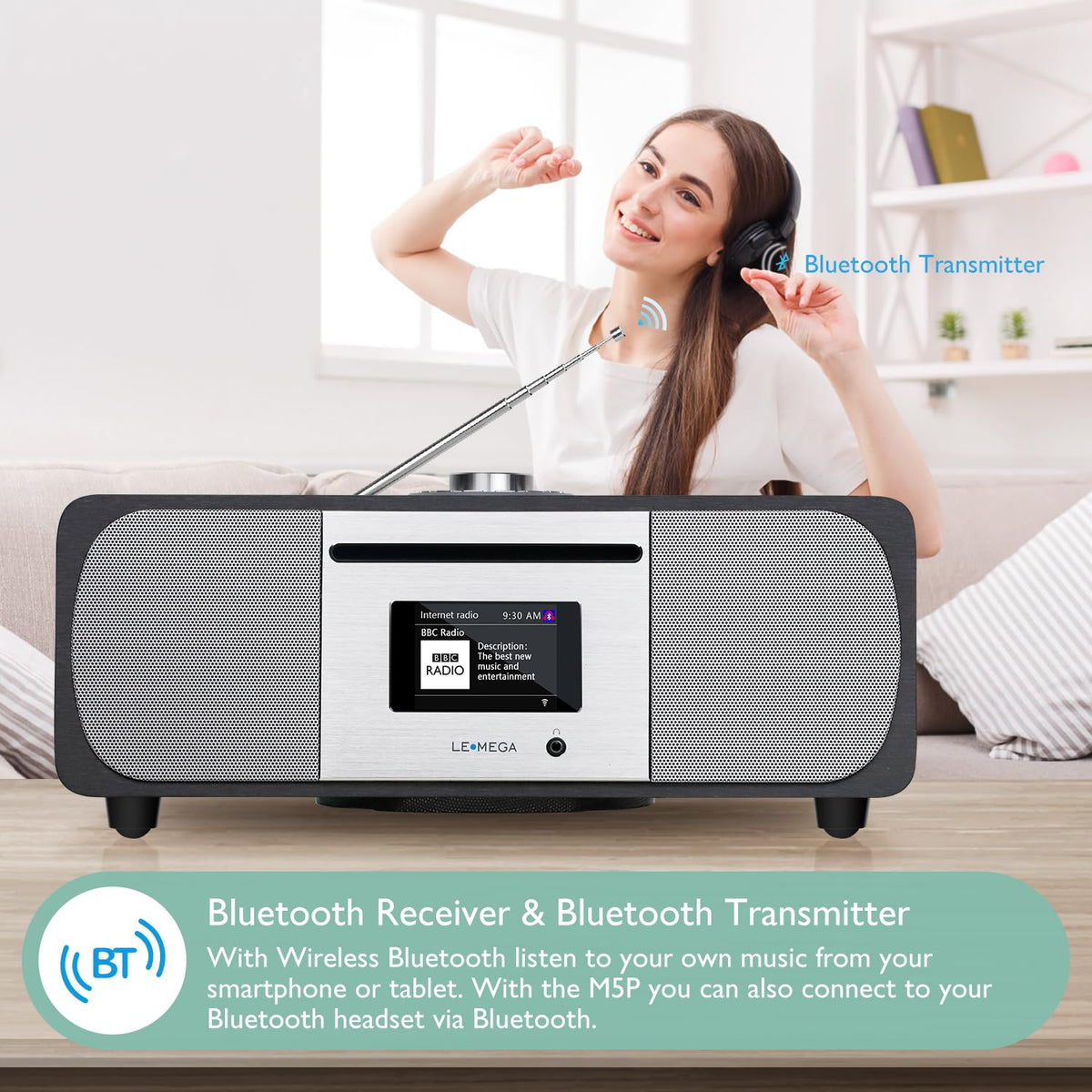 Upgrade Version M5P+ New Release Add Bluetooth Transmitter Feature With Slot-In Cd Player, Fm Radio, Internet Radio And Built-In Spotify Connect, Bluetooth Receiver, Everything In One Unit Gives You Multiple Ways To Enjoy Your Favorite Music And Radios. Two Front-Facing 2.5� Full Range Speakers And A Built-In 5.25� Subwoofer, Audio Power 35W Producing Very Powerful Distortion-Free Stereo Sound That Full Fills In Your Home. Hand-Crafted Furniture-Grade Wood Box In Walnut/White Oak/Black Oak Finish With An Anodized Aluminum Front Panel And Knobs, Beautiful Furniture Stylish Design Fits In Your Home Perfectly.