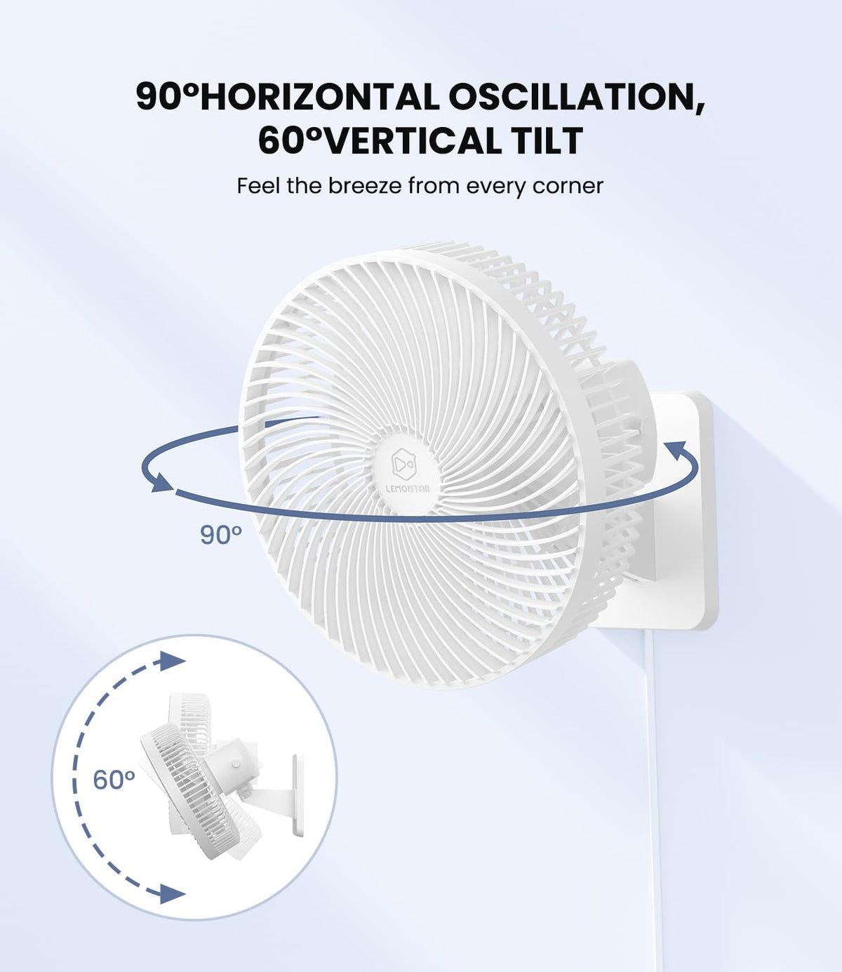 Lemoistar 10 Inch Wall Mounted Fan With Remote Control, 90 Oscillating, 4 Speeds, 4 Timer, Adjustable Tilt, 70 Inch Cord, Quiet,