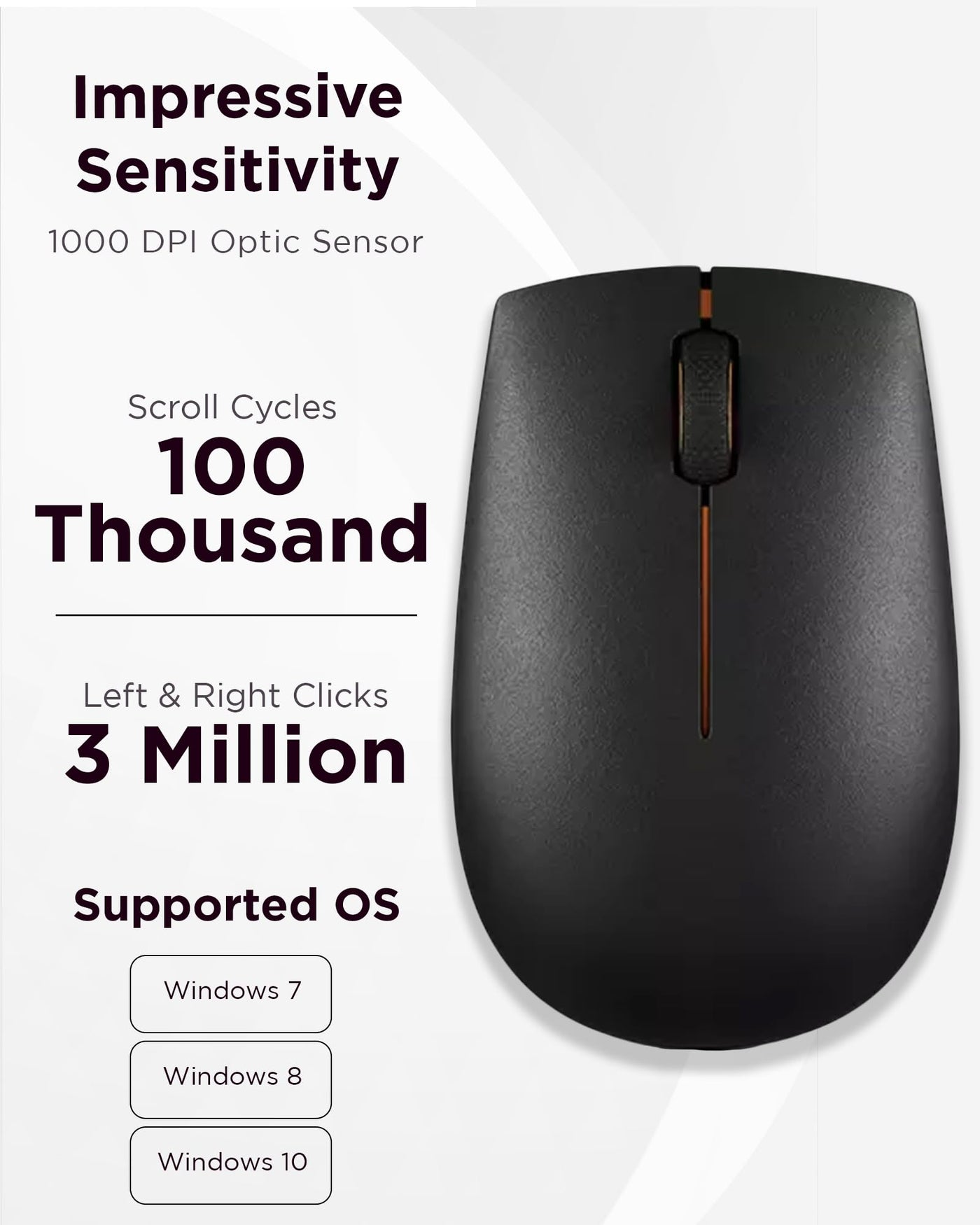The Lenovo 300 Wireless Compact Mouse Is Designed To Offer The Best Balance Between Mobility And Function. This Wireless Mouse Features A 1000 Dpi Sensor, 3 Buttons, And A Unique Ergonomic Contour To Give You The Freedom To Create Whenever And Wherever. The Convenient Nand Usb Receiver Can Be Stored Right Inside The Body Of The Mouse So It Never Gets Lost, While The 2.4Ghz Wireless Technology Keeps You Connected When The Dongle Is Plugged In. This Affordable Compact Cordless Mouse Boasts A 12-Month Battery Life From A Single Aa Battery And A Super Portable Design. With Its Small Size And Light Weight, It Slips Easily Into Your Laptop Bag To Travel With You Wherever You Need To Go. Its A Wireless Computer Mouse Thats Perfect For Working Professionals, College Students, And Anyone Who Wants The Convenience And Simplicity Of A Reliable Product. Specifications - 1000 Dpi - 2.4Ghz Wireless Technology - 3 Buttons: (1) Left Click, (2) Right Click, (3) Click Wheel> - Standard Scroll Wheel> - Buttons (L/R) Life: 3 Million Clicks - 1 Aa Battery For 12 Months Life
