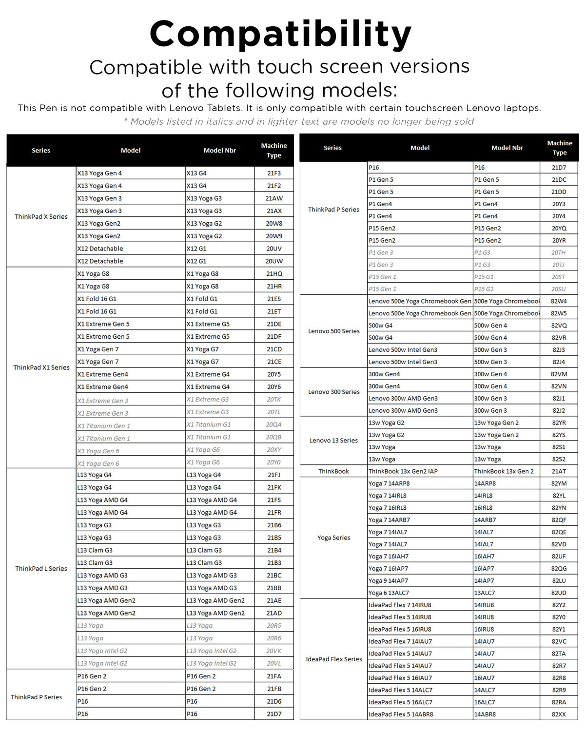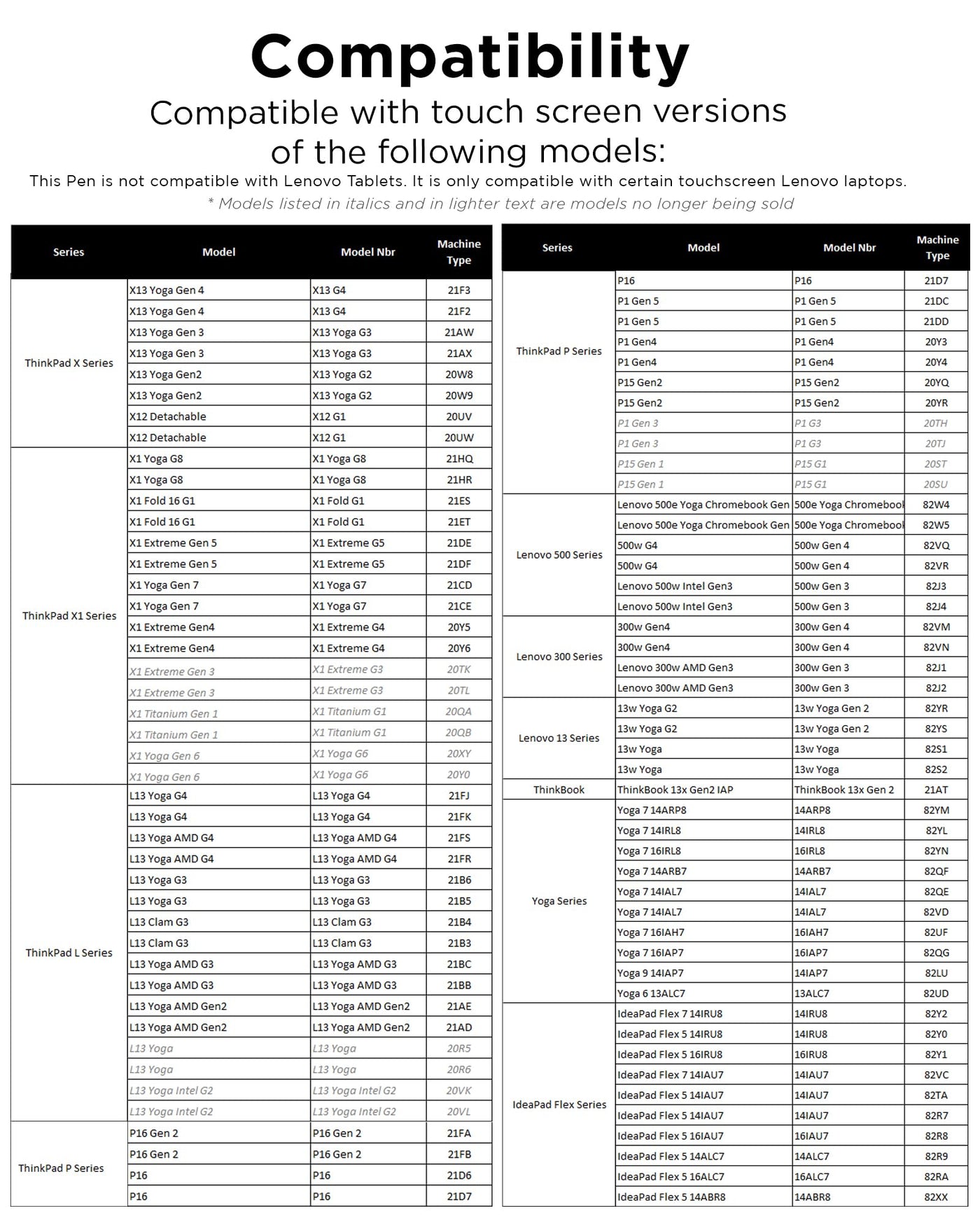 Q: What devices are compatible with the Lenovo Digital Pen 2?A: The Lenovo Digital Pen 2 is compatible with touch screen versions of various models, including IdeaPad Flex 5 (14ALC7-82R9, 14IAU7-82R7, 16ALC7-82RA, 16IAU7-82R8), Yoga 6 (13ALC7-82UD), Yoga 7 (14ARB7-82QF, 14IAL7-82QE, 14IAL7-82VD, 16IAH7-82UF, 16IAP7-82QG), Yoga 9 (14IAP7-82LU), and ThinkBook 13x G2 IAP-21AT.