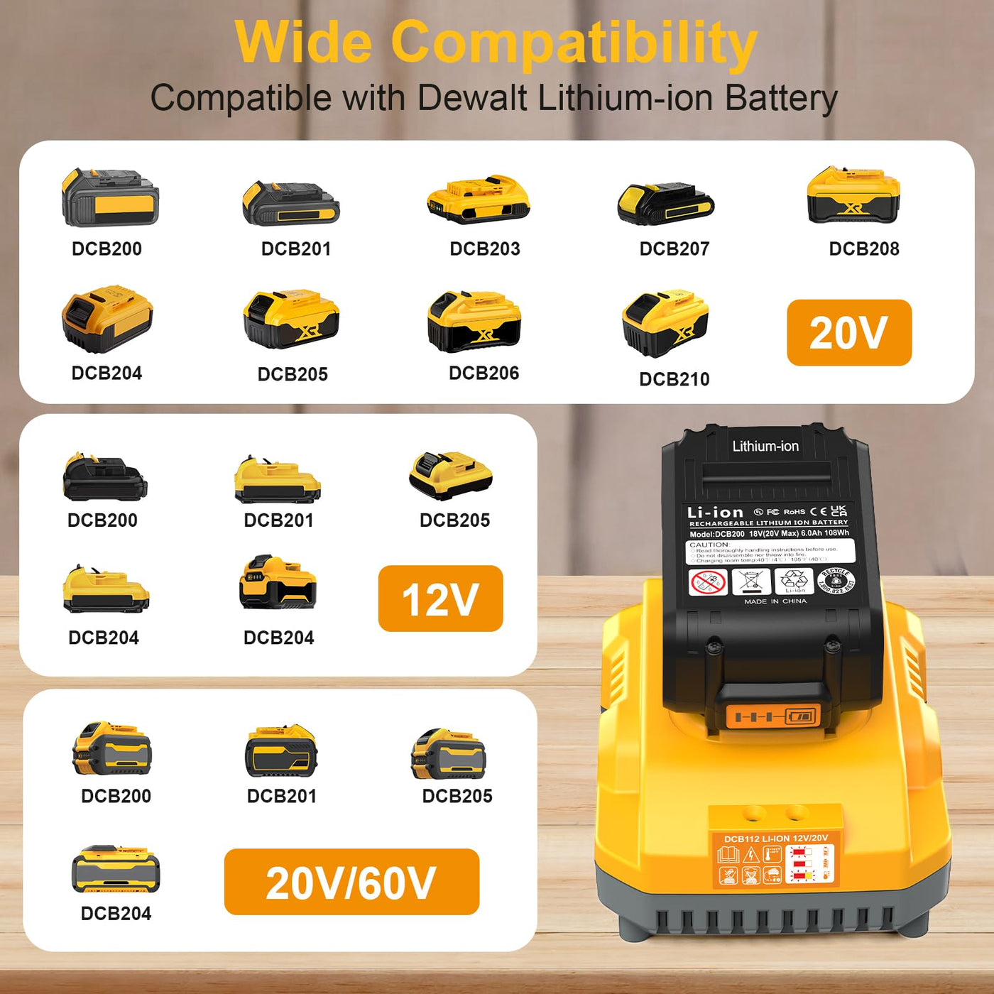 Q: Is the Lenoya DCB112 charger compatible with all Dewalt 12V and 20V batteries?A: Yes, the Lenoya DCB112 charger is compatible with various Dewalt 12V and 20V batteries including models DCB200, DCB203, DCB125, and DCB107, among others.