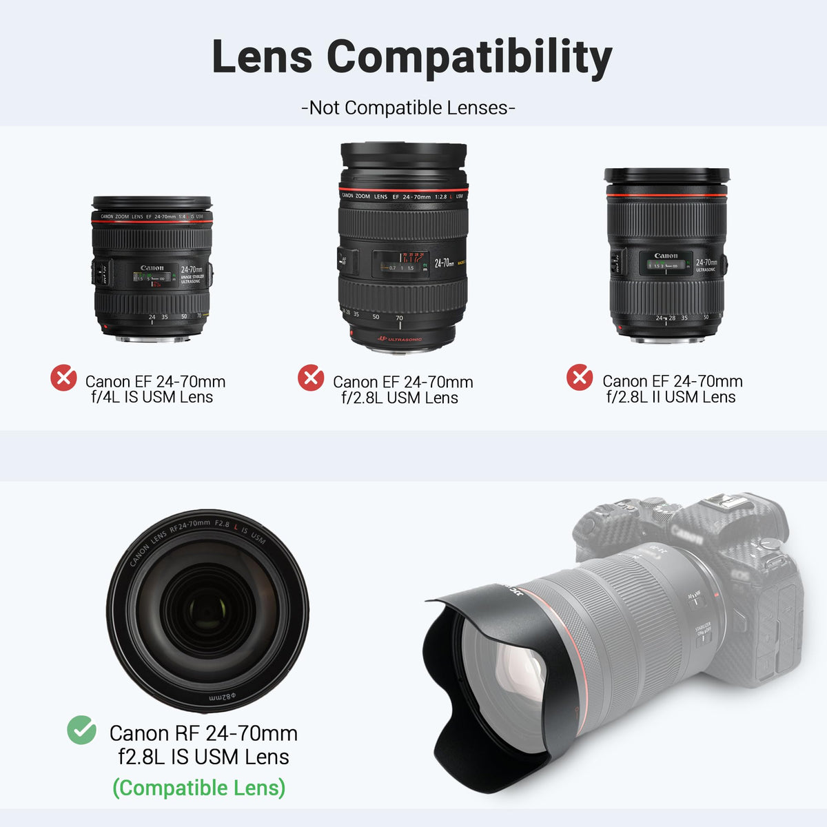 Q: Is the JJC LH-88E lens hood compatible with Canon RF 24-70mm f/2.8L IS USM Lens?A: Yes, the JJC LH-88E lens hood is specifically designed for the Canon RF 24-70mm f/2.8L IS USM Lens, providing optimal protection and functionality.