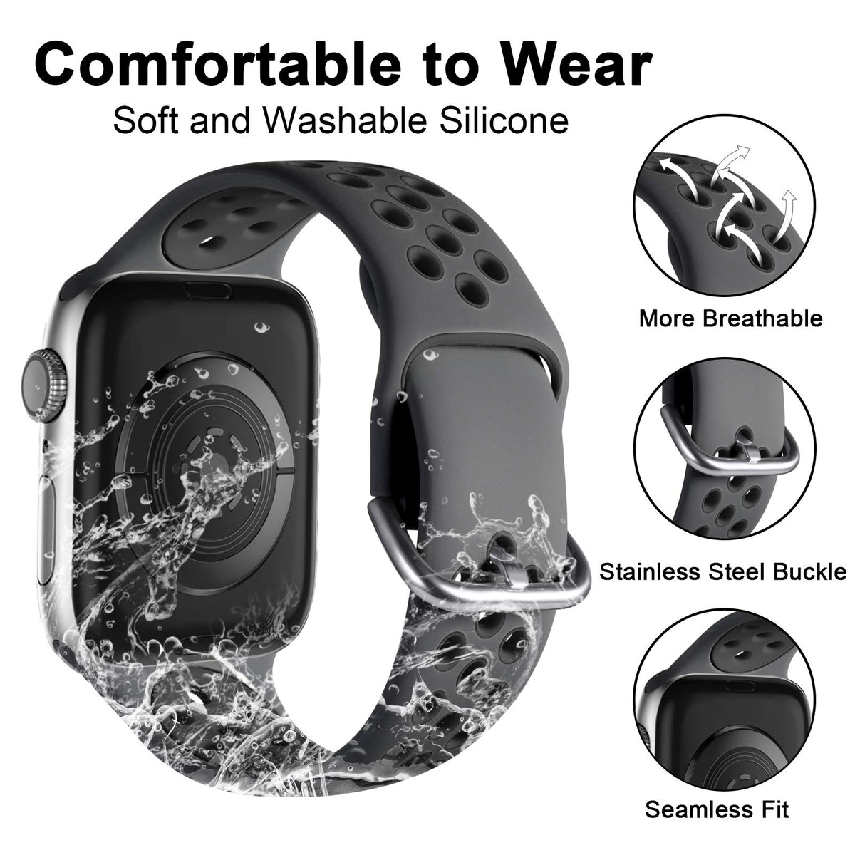 Q: What are the main features of the Lerobo Apple Watch bands?A: The Lerobo Apple Watch bands feature a soft silicone material that is lightweight, durable, and breathable. They include an air-hold design for comfort, are water and sweat-resistant, and come in unique double colors to enhance your smartwatch's appearance.