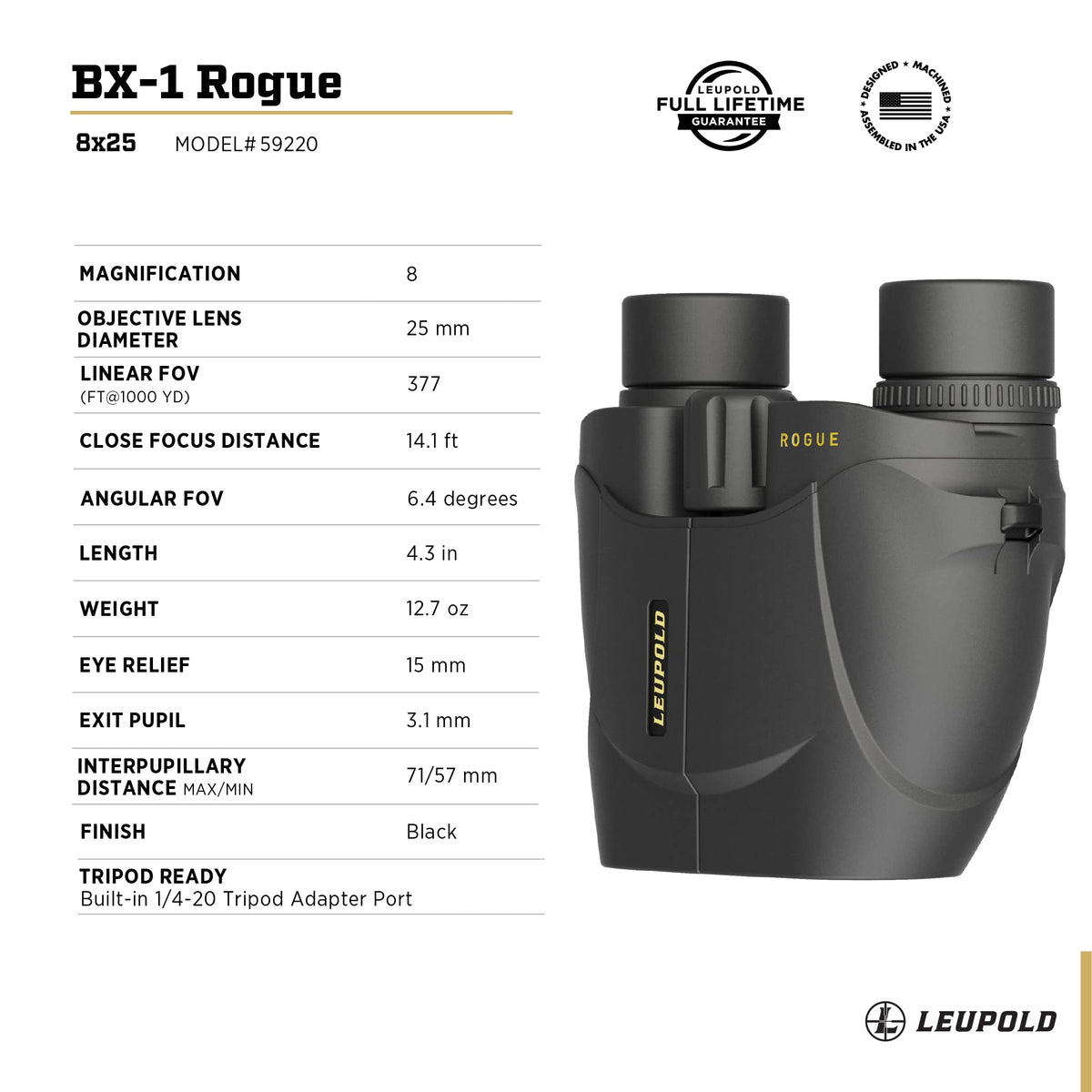 Q: What is the warranty or customer support like for Leupold products?A: Leupold offers legendary customer care, and their products are backed by a comprehensive warranty. Should you experience any issues with your BX-1 Rogue Binoculars, you can contact their customer support for assistance or repairs.