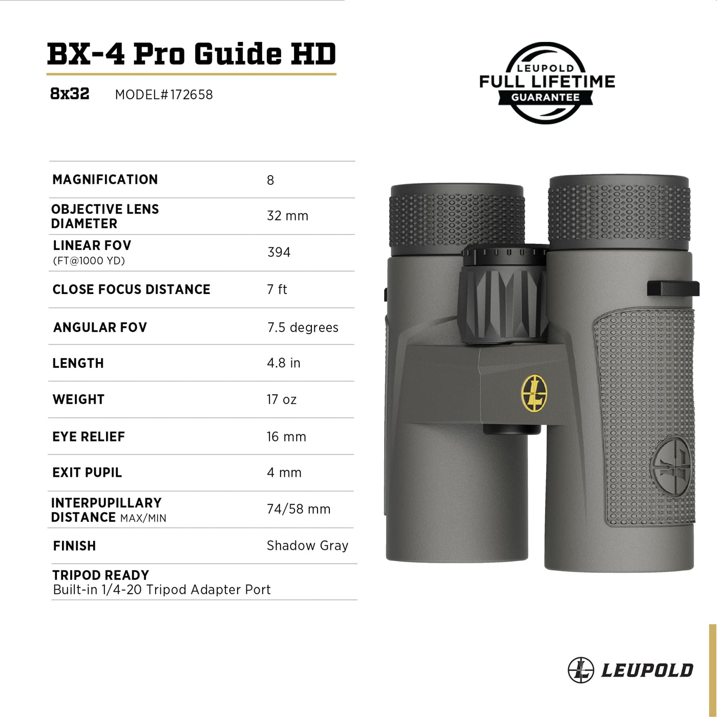 A Full-Size Bino Isn'T Always The Solution. Enter Our Compact Bx-4 Pro Guide Hd 8X32Mm Binocular. We Decreased The Magnification And Objective Size To Reduce Weight, All While Maintaining The Elite Level Of Performance You'D Expect From A Full-Size Binocular. Built Around Leupold'S Elite Optical System, The Bx-4 Pro Guide Hd Binocular Offers Excellent Dawn-To-Dusk Light Transmission For A Bright Image When It Matters Most, Elite-Level Glare Reduction In Harsh Light, And The Resolution And Clarity That Diehard Hunters Demand. The Ergonomic, Open-Bridge Design Is Comfortable For Extended Glassing Sessions And Delivers Key Weight Savings For Those Long Backcountry Adventures. It Comes With Pro Gear Accessories, Too: Including A Go Afield Shoulder Strap, Binocular Case, Lens Covers, And Lens Cloth. And Like All Leupold Binoculars, It'S Fogproof, Waterproof, And Guaranteed To Perform For Life.