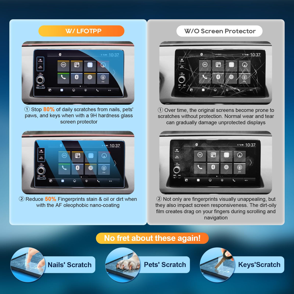 Q: What level of protection does this tempered glass screen protector offer?A: This screen protector features a 9H hardness rating, providing excellent defense against scratches, dust, and minor impacts, ensuring your infotainment display remains in pristine condition.