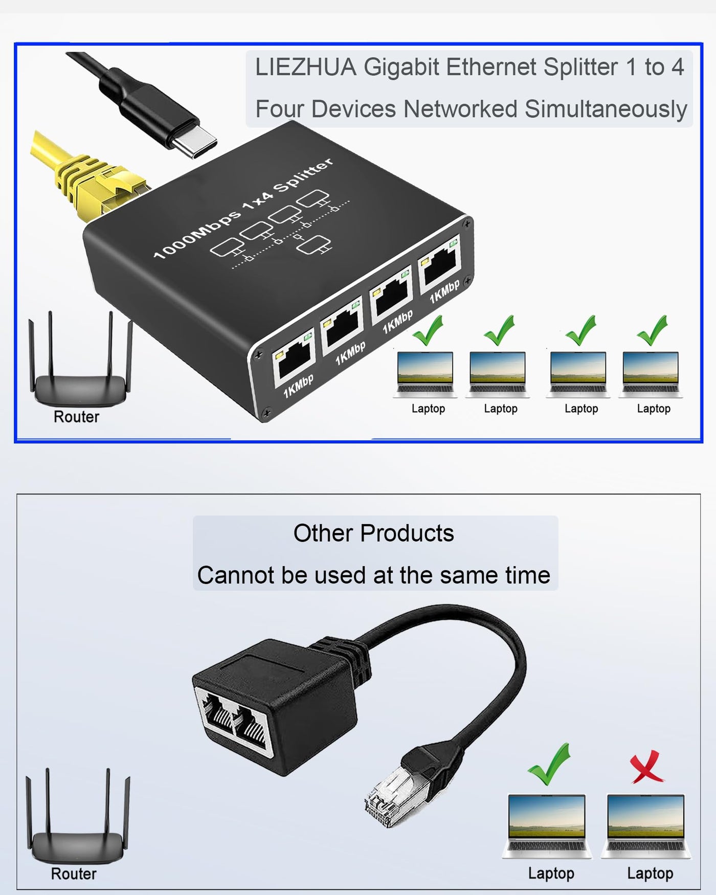 Liezhua Ethernet Splitter 1 To 4, 1000Mbps High Speed Ethernet Cable Splitter With Lan Cable Cat 6 [4 Devices Simultaneous Netwo