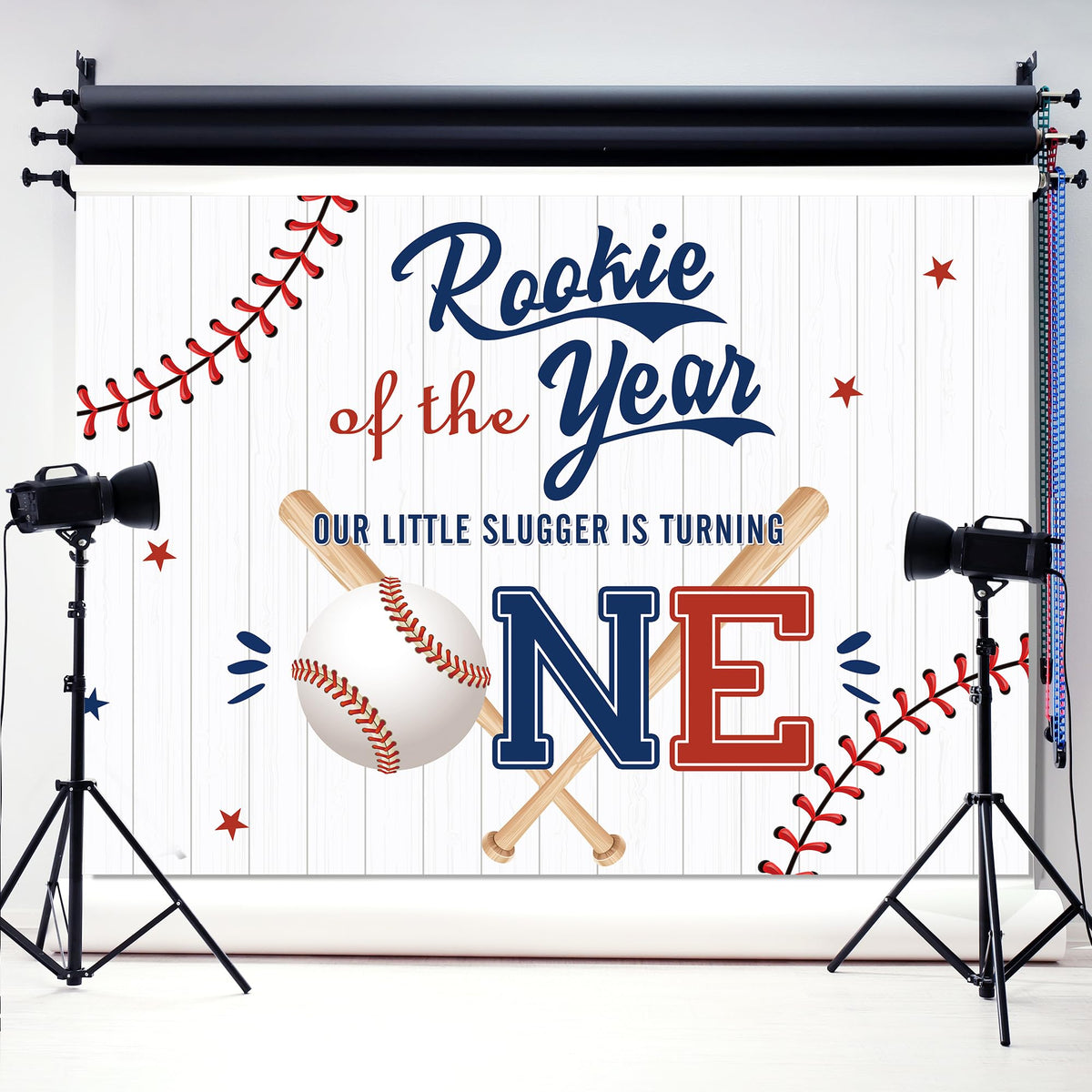 Lightinhome Baseball 1St Birthday Backdrop 7Wx5H Feet Rookie Of The Year Blue Red Wooden Plank Slugger Is Turning One Boys Bday