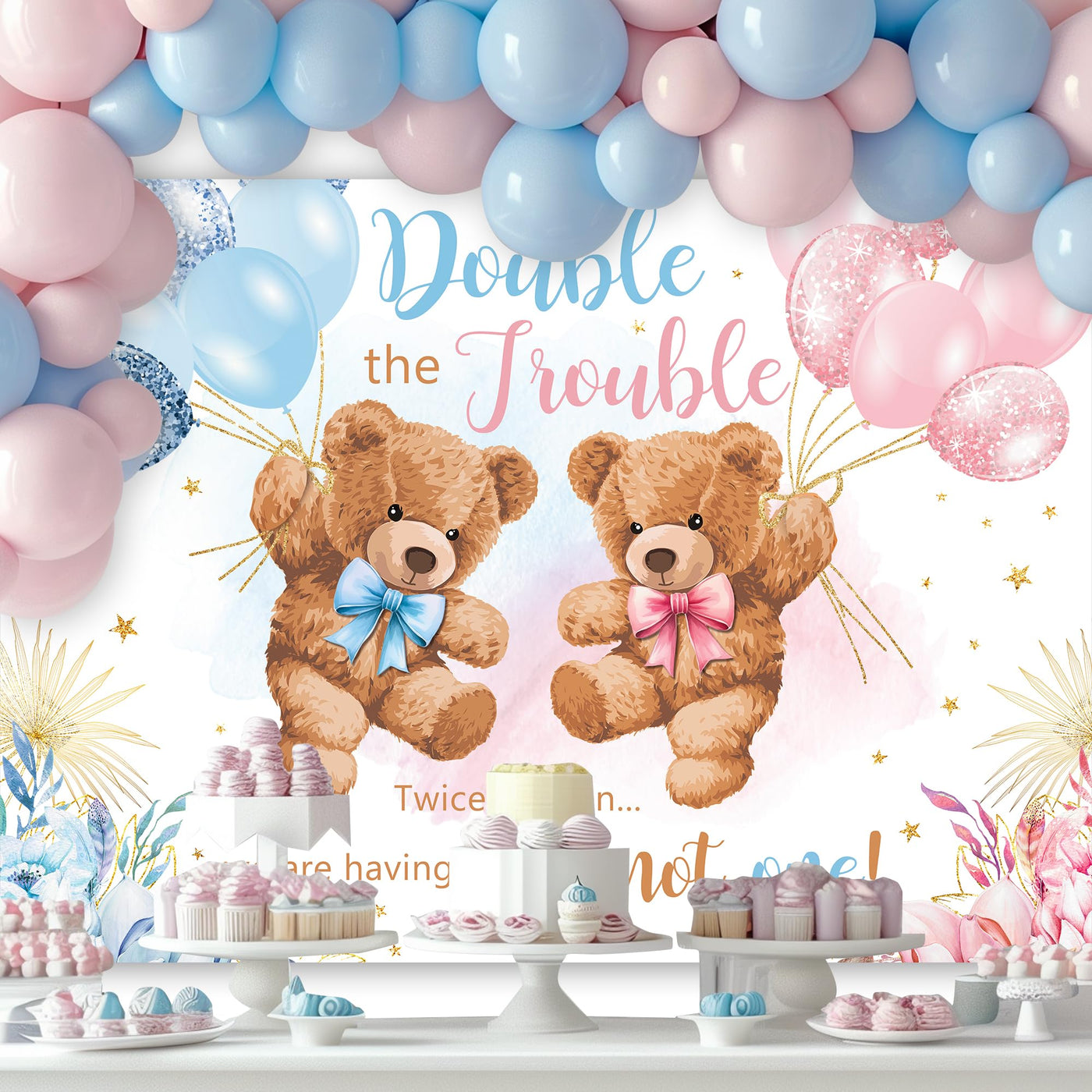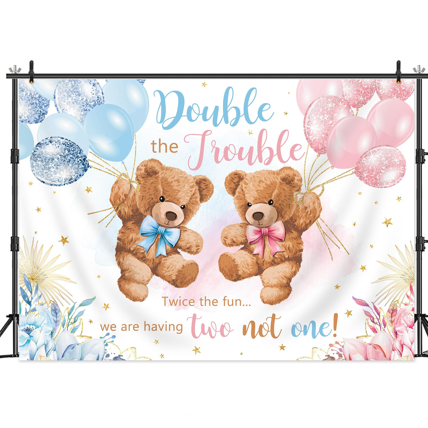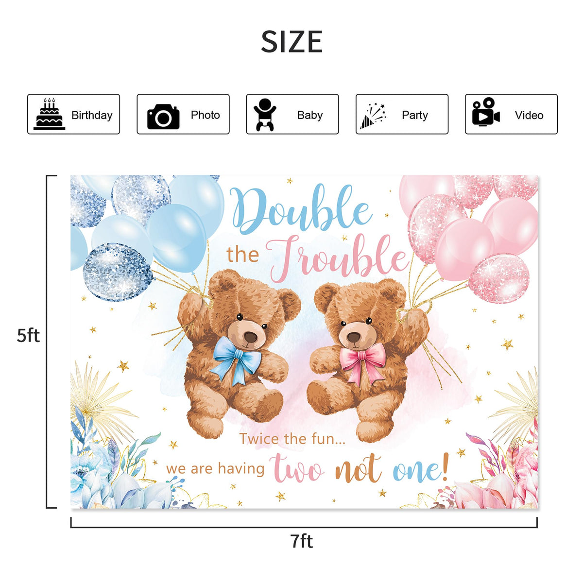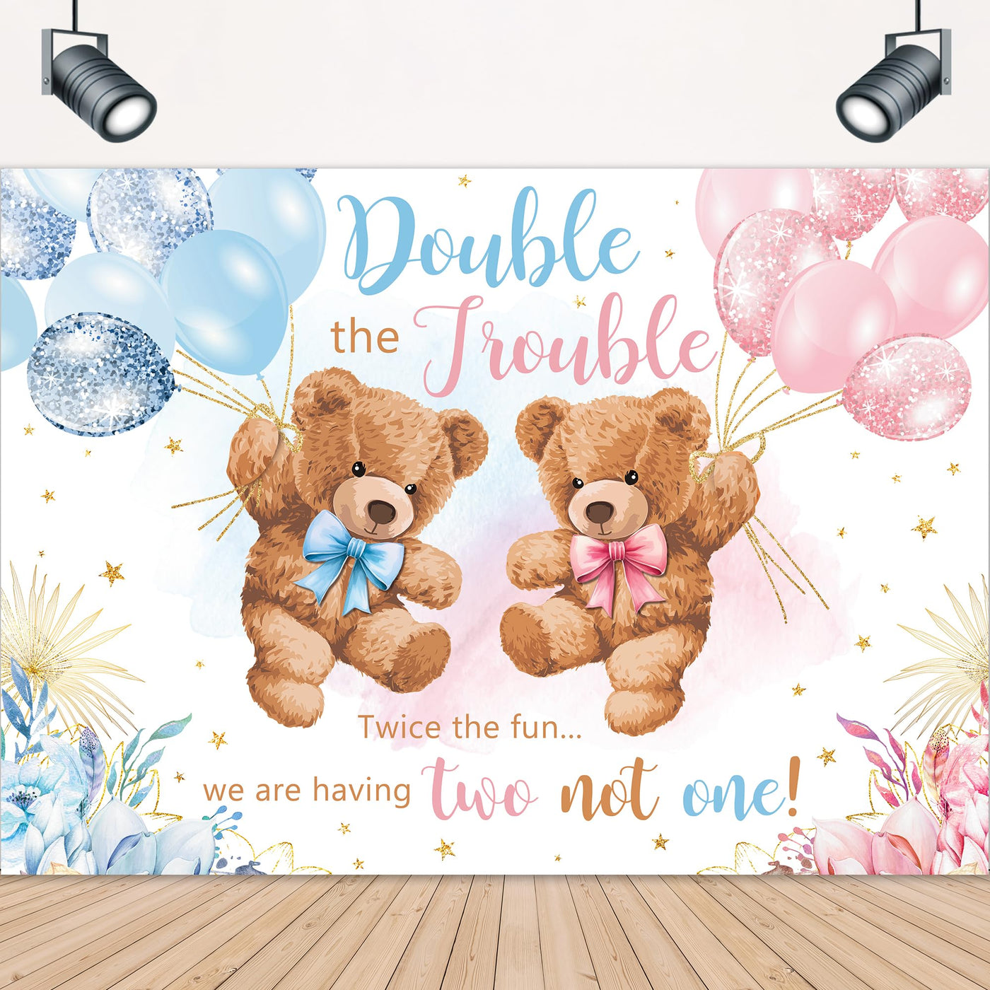 Lightinhome Double The Trouble Twice The Fun We Are Having Backdrop 7Wx5H Feet For It'S Twins Baby Shower Blue Pink Bear Gender