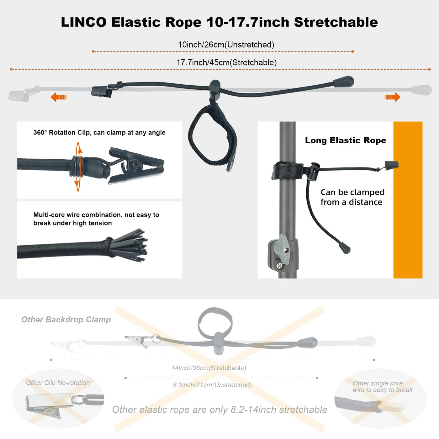Q: How much weight can each backdrop clamp support?A: Each LINCO backdrop clamp can support up to 10lbs, making them suitable for various backdrop types and lighting setups.