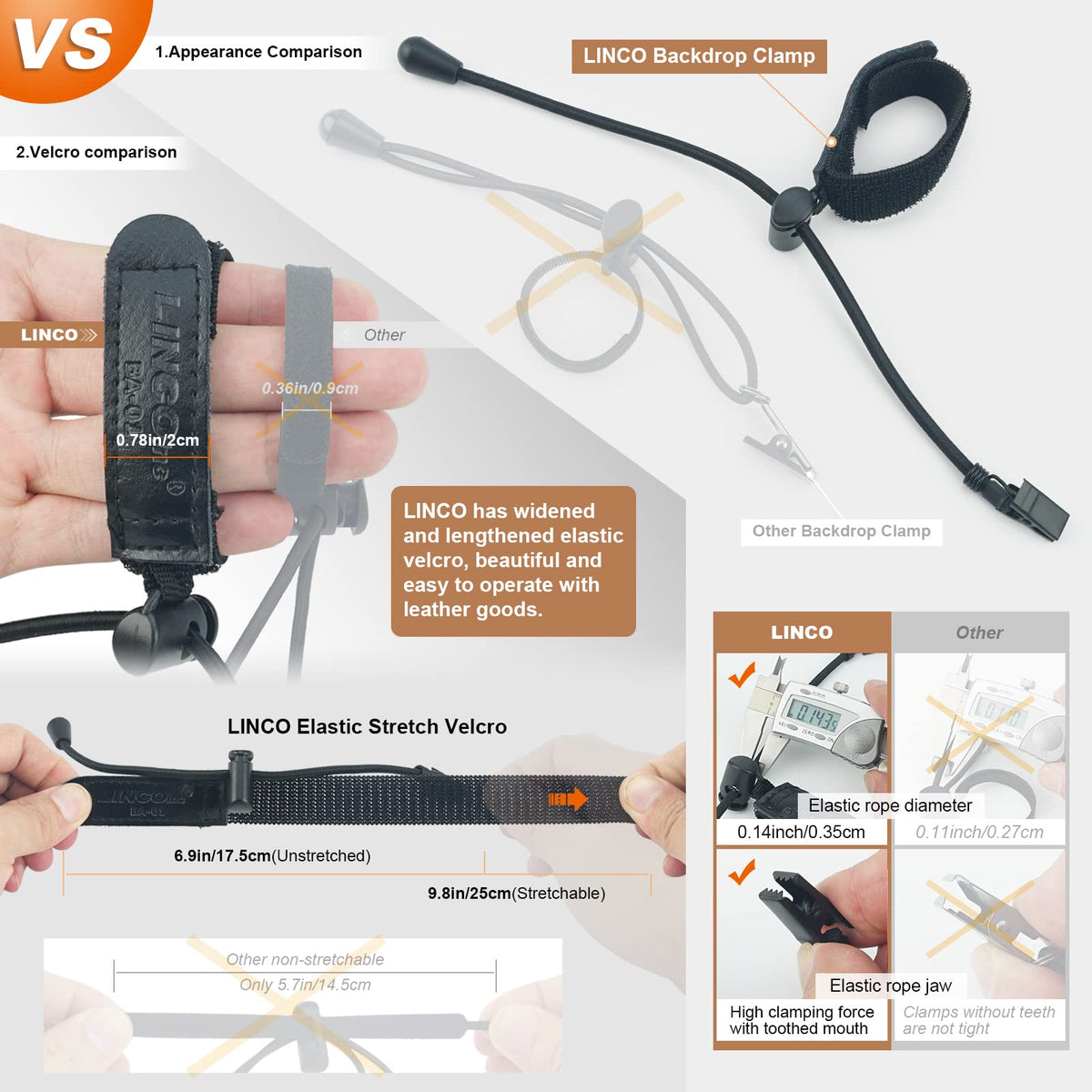 Q: What materials are the LINCO backdrop clamps made of?A: The LINCO backdrop clamps are made of high-quality leather and flexible materials, ensuring durability and effective performance.