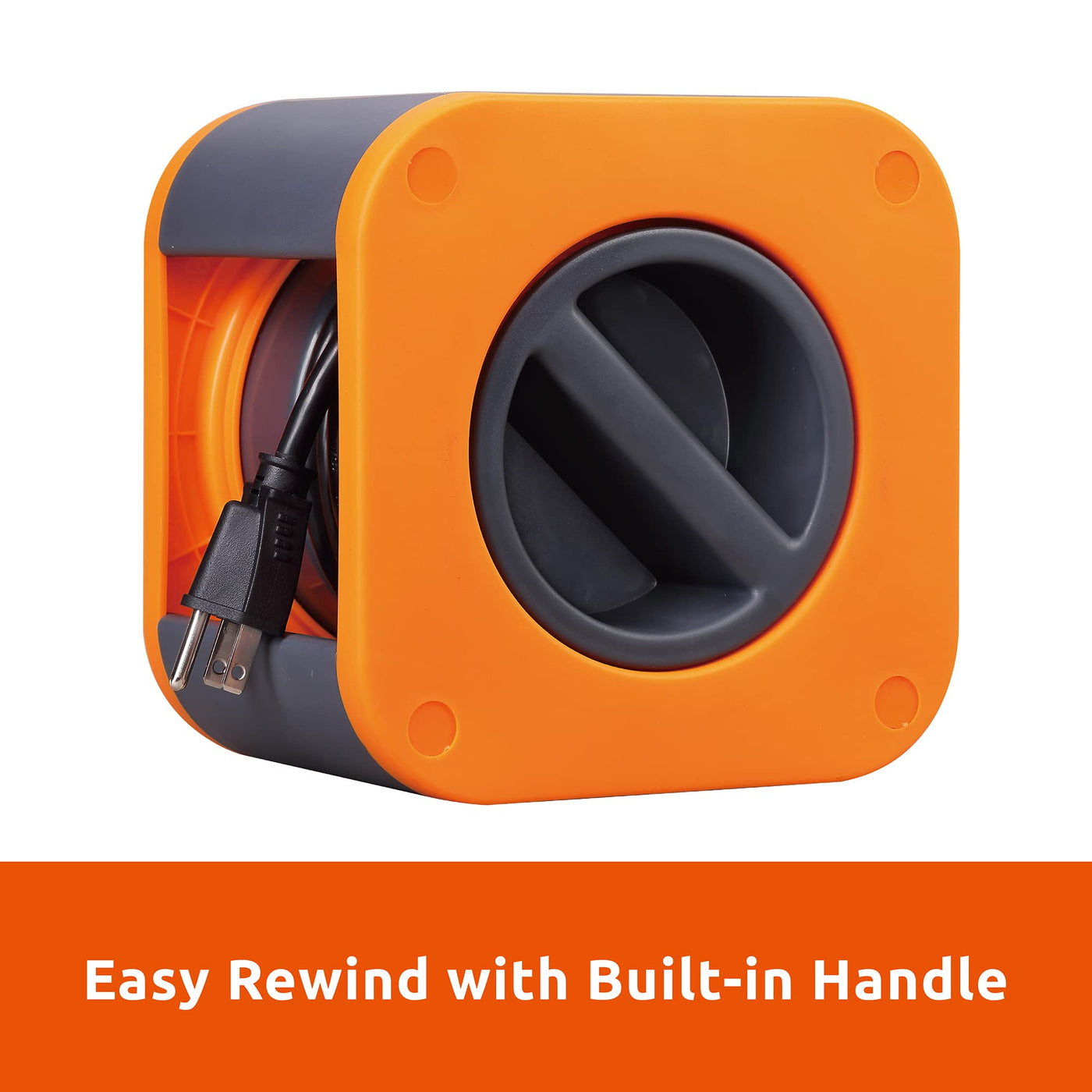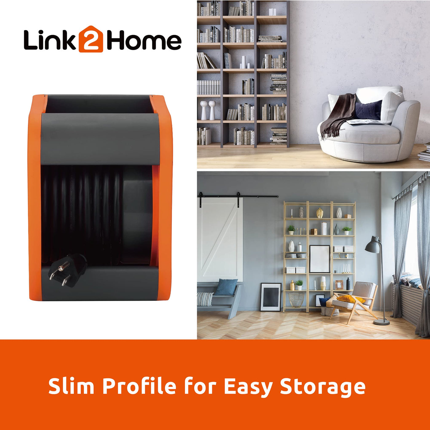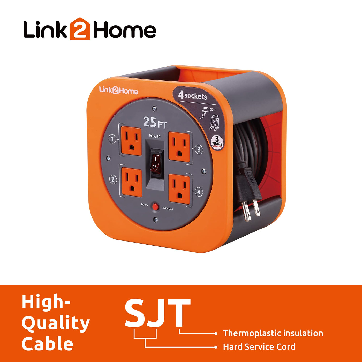 Link2Home Cord Reel 25 Ft. Extension Cord 4 Power Outlets With 16 Awg Sjt Cable Is The Perfect Power Solution For Your Home, Garage, Backyard, Tiny Spaces, Urban Living Or Office. Tangle Free Cord Management Helps Cords Stay Organized And Tidy For Next Use. Extension Cord Reel Features Easy Grip Handle For Smooth Rewind. Compact Design Enables Easy Storage For When Not In Use. Lightweight Four Handle Design. 3 Year Warranty.