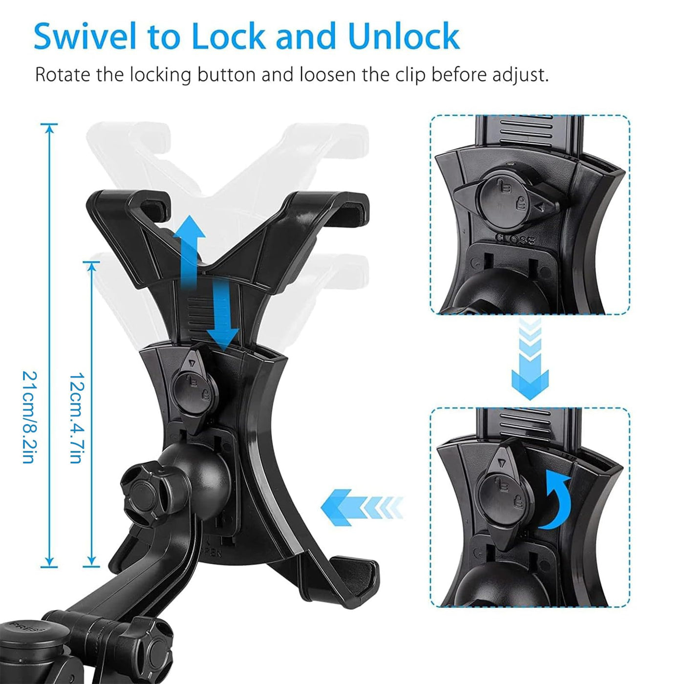 Q: How does the 360-degree rotation feature work?A: The 360-degree rotation feature allows you to easily adjust the position of your tablet holder. It provides a flexible viewing angle, enabling both vertical and horizontal orientations without obstructing your view while driving.