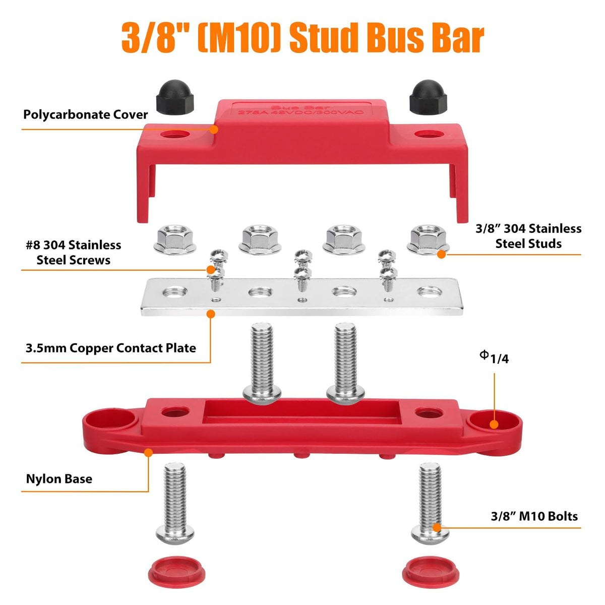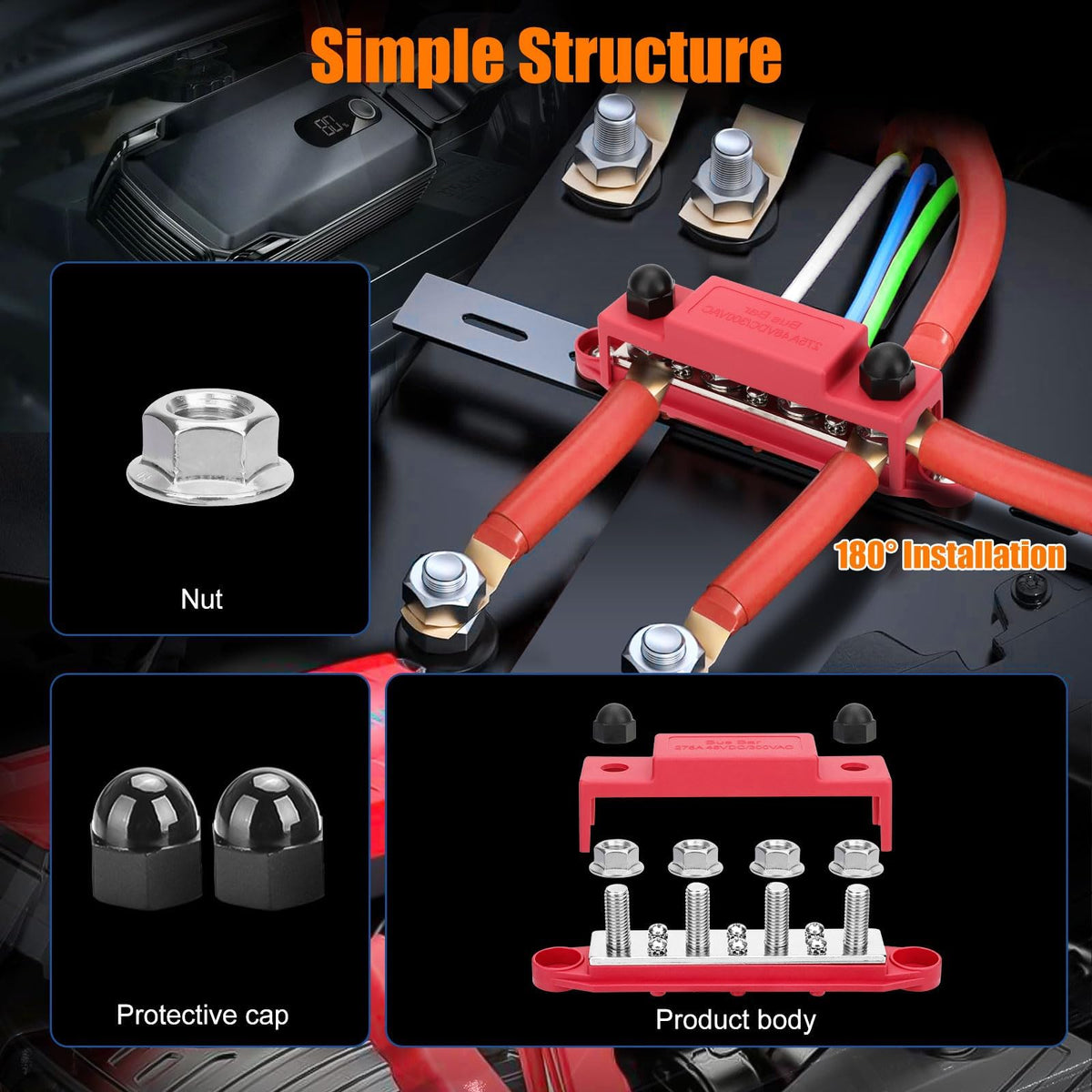 Heavy Duty: Our 12V Power Distribution Block Crafted From Zinc Alloy And Brass, 304 Stainless Steel Studs And A Flame-Retardant Insulated Nylon Base,The 3.5Mm Copper Bar Is Thicker Than Others' 2.0Mm Brass Busbar, It Guarantees Low Resistance, Maximum Conductivity, And Robust Corrosion Protection. Furthermore, Each Power Busbar Will Come With A Detachable Nylon Cover, Isolating Metal Components To Prevent. Operating Voltage/Amperage Range: Max Amperage: 275 Amps, Max Volts: 48 Vdc. Each Bus Bar You Can Safely Wire Up To 4 Accessorie For Running A Dedicated Ground To The Battery And Offers More Minor Gauge Connections For Lower Voltage. Wide Application: The Rv Marine Bus Bar With Cover Aims To Make The Wiring Of Circuit Become Neat And Tidy, Preventing Mess Harness From Causing Electric Short Circuit, Our 275 Amp 4-Post Power Distribution Block Busbar Is Ideal For 12-48V Automotive, Car Audio, Solar, And Marine Use. Whether You Need To Consolidate, Distribute, Or Protect Your Electrical System, Our Bus Bars Are Excellent For Managing Wires And Distributing Power.