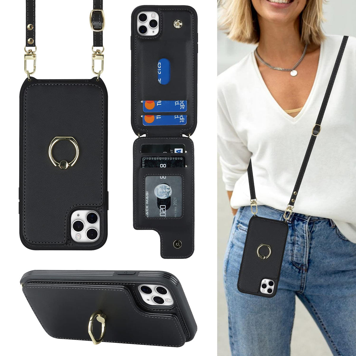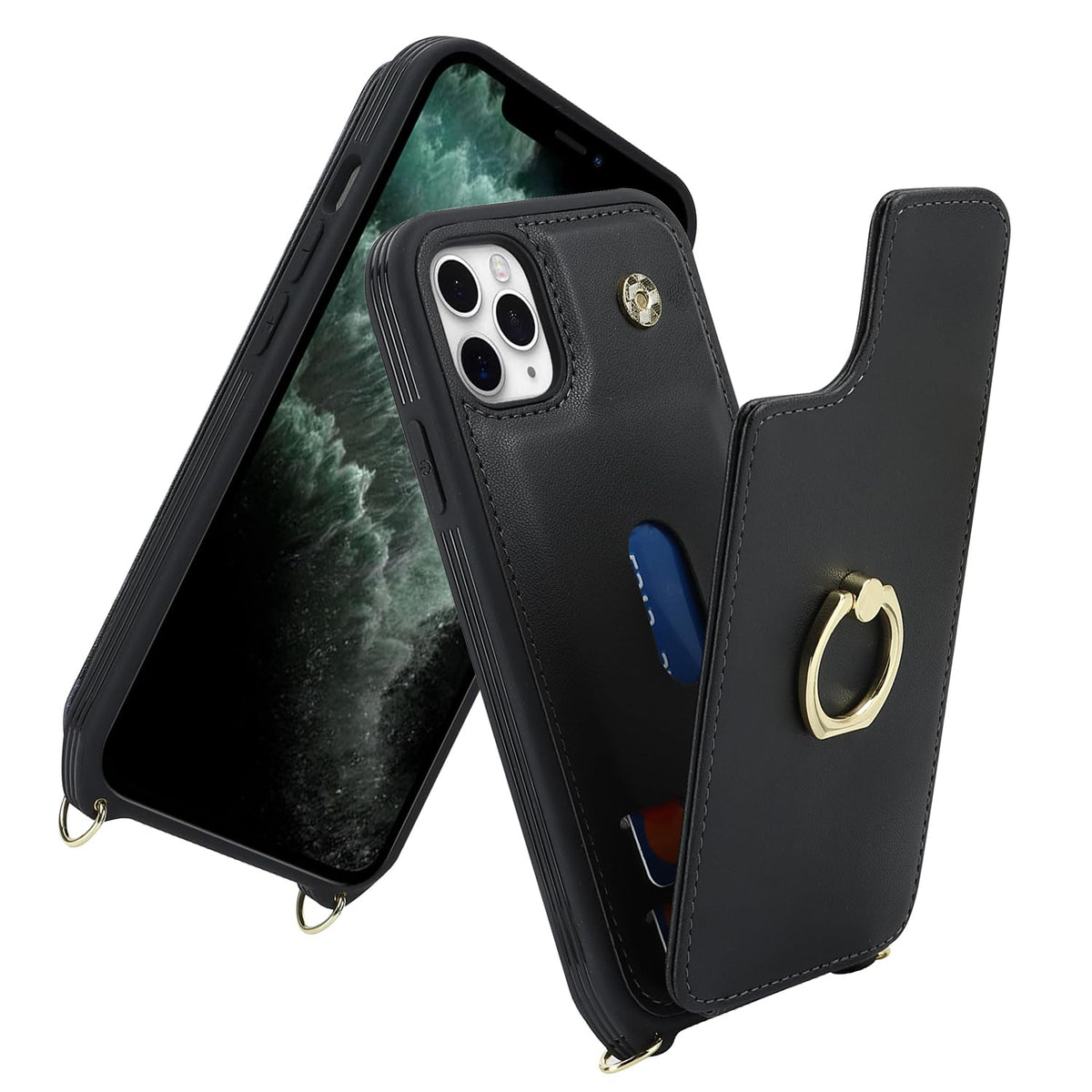 Lipvina For Iphone 11 Pro Phone Case With Card Holder And Strap For Women,Crossbody Lanyard,Kickstand Ring Stand,Snap Clasp,Phon