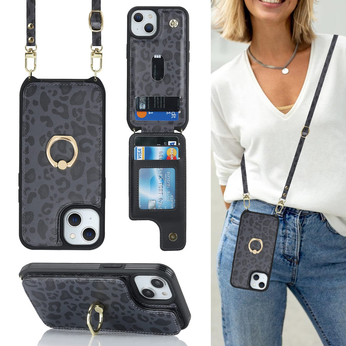 Lipvina For Iphone 13 Case With Card Holder For Women,Phone Case With Strap,Crossbody Lanyard,Ring Stand,Snap Clasp,Cute Wallet