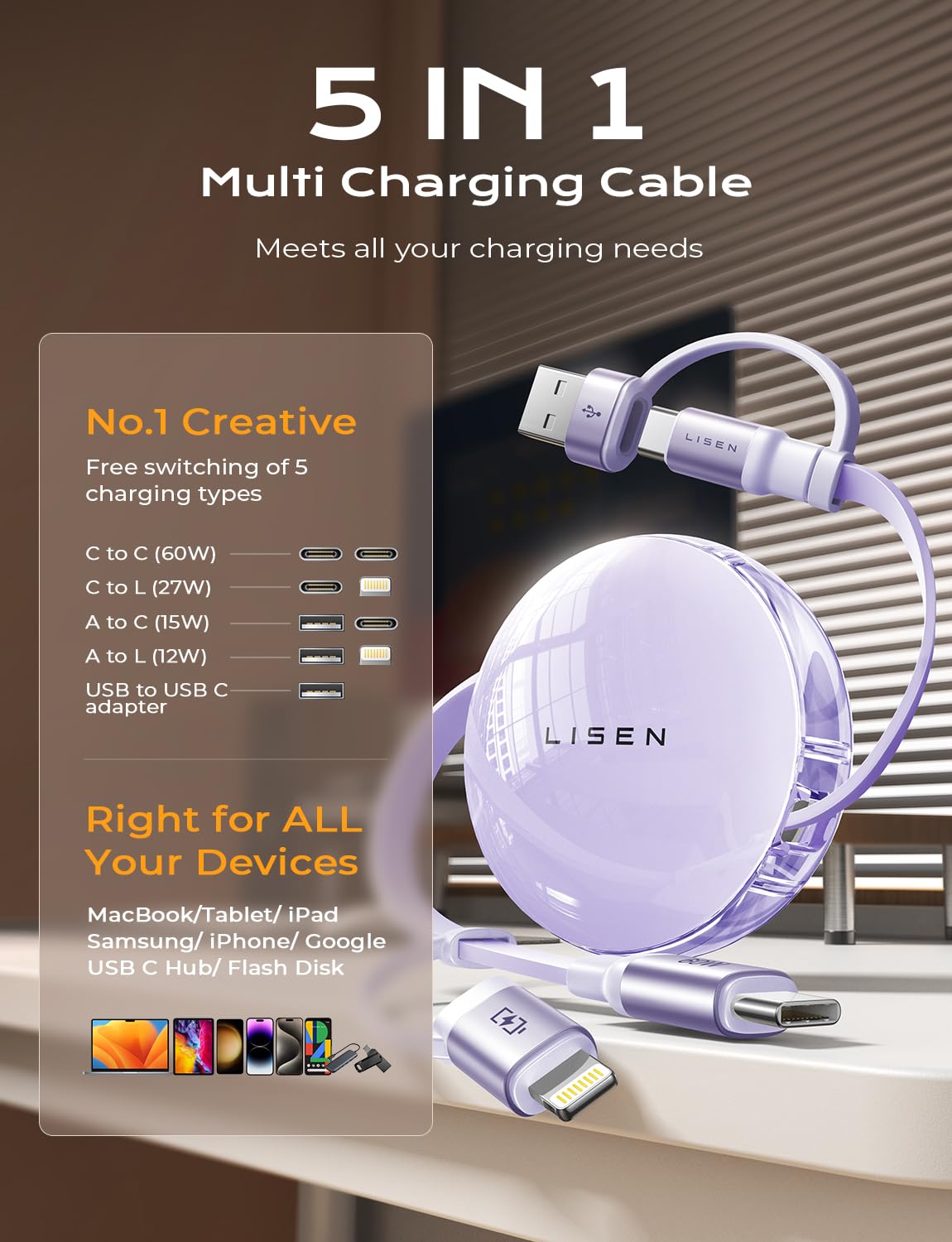 ?Lisen 5 In 1 Multi Charging Cable-Meet All Your Charging Needs?Lisen Cost-Effective 5 In 1 Cable Can Satisfy Multiple Charging Demands For You. Offers 5 Different Ports Combination: C To C Port(Pd 60W), C To L Port( Pd 27W), A To C Port, A To L Port, And Usb To Usb C Adapter. Easy To Switch Between Lightning/Usb C/Usb A Port. This Is A One-Stop Shop For Android And Apple Devices. Available Anytime, Anywhere. Hot-Plug Supported. You Will Simply Be Floored By Its Versatility And Ease Of Use!!!