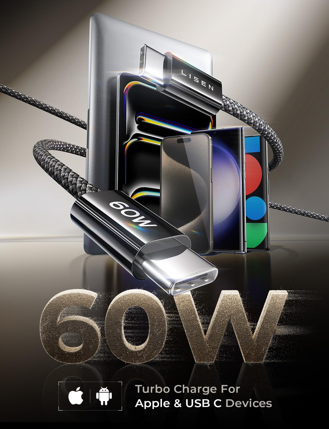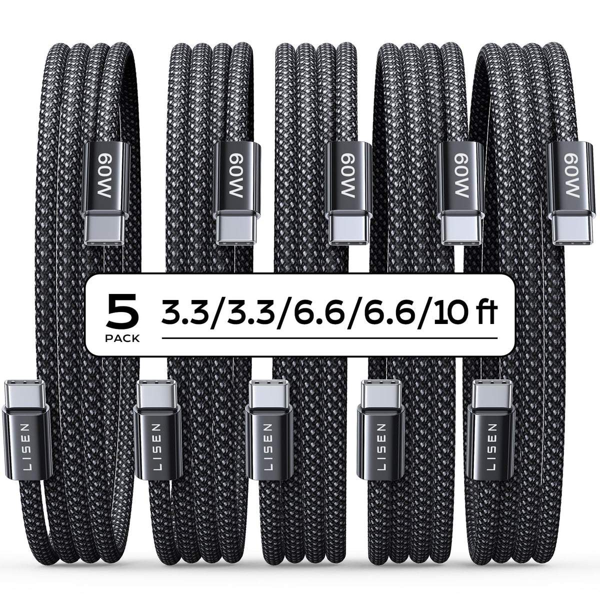 Lisen Usb C Cable, 5 Pack [3.3/3.3/6.6/6.6/10Ft] Usbc To Usbc Cable For Iphone 15 Pro Max Plus, 60W (3.1A) C To C Cable Fast Cha