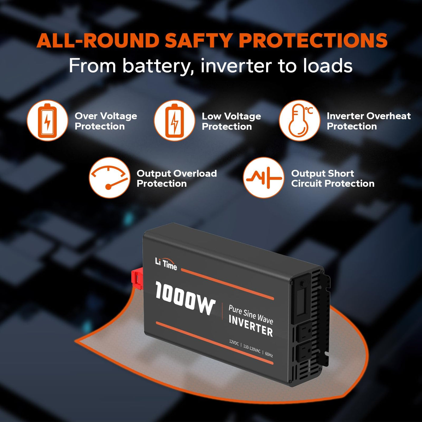 This 1000W Pure Sine Wave Inverter Is A High-Performance 1000W Inverter Designed To Deliver Clean, Stable Pure Sine Wave Power For Your Most Essential Devices. Whether Youre Powering Sensitive Electronics In Your Rv, Keeping Appliances Running During Camping Trips, Or Maintaining Essential Power In Off-Grid Solar Setups, This Advanced Inverter Charger Ensures Reliable Performance With An Impressive 91% Conversion Efficiency. Engineered For Versatility, This Sine Wave Inverter Produces A Smooth, Stable Ac Waveform Thats Safe For Medical Equipment, Laptops, And Other Sensitive Electronics, While Its Robust 2000W Surge Capacity Effortlessly Handles Power Tools, Small Appliances, And Other Demanding Loads. The Litime Inverter Features A Built-In Lcd Display For Real-Time Monitoring Of Voltage, Load Status, And System Temperature, Giving You Complete Control Over Your Power Supply. As A Solar Inverter Charger, This Unit Seamlessly Integrates With Renewable Energy Systems, While Its Pure Sine Inverter With Transfer Switch Capability Ensures Uninterrupted Power When Switching Between Energy Sources. The Battery Inverter Functionality Provides Reliable Backup Power During Outages, And The Compact, Rugged Design Makes It Ideal For Both Mobile And Stationary Applications. Built To Withstand Challenging Conditions, This Litime 1000W Pure Sine Wave Inverter Operates Flawlessly In Temperatures Ranging From -20C To 40C, Thanks To Its Advanced Cooling System And Comprehensive Protection Against Voltage Fluctuations, Overheating, And Short Circuits. Whether You Need A Dependable Solar Power Inverter For Your Cabin, A Robust 1000 Watt Inverter Litime For Your Truck, Or A Versatile Power Solution For Emergency Preparedness, This Inverter Delivers Professional-Grade Performance In A Compact Package. Backed By Litimes Industry-Leading Customer Support And Stringent Quality Certifications, The 1000W Inverter Is Your Trusted Companion For All Power Conversion Needs, Combining Reliability, Efficiency, And Convenience In One Powerful Unit.