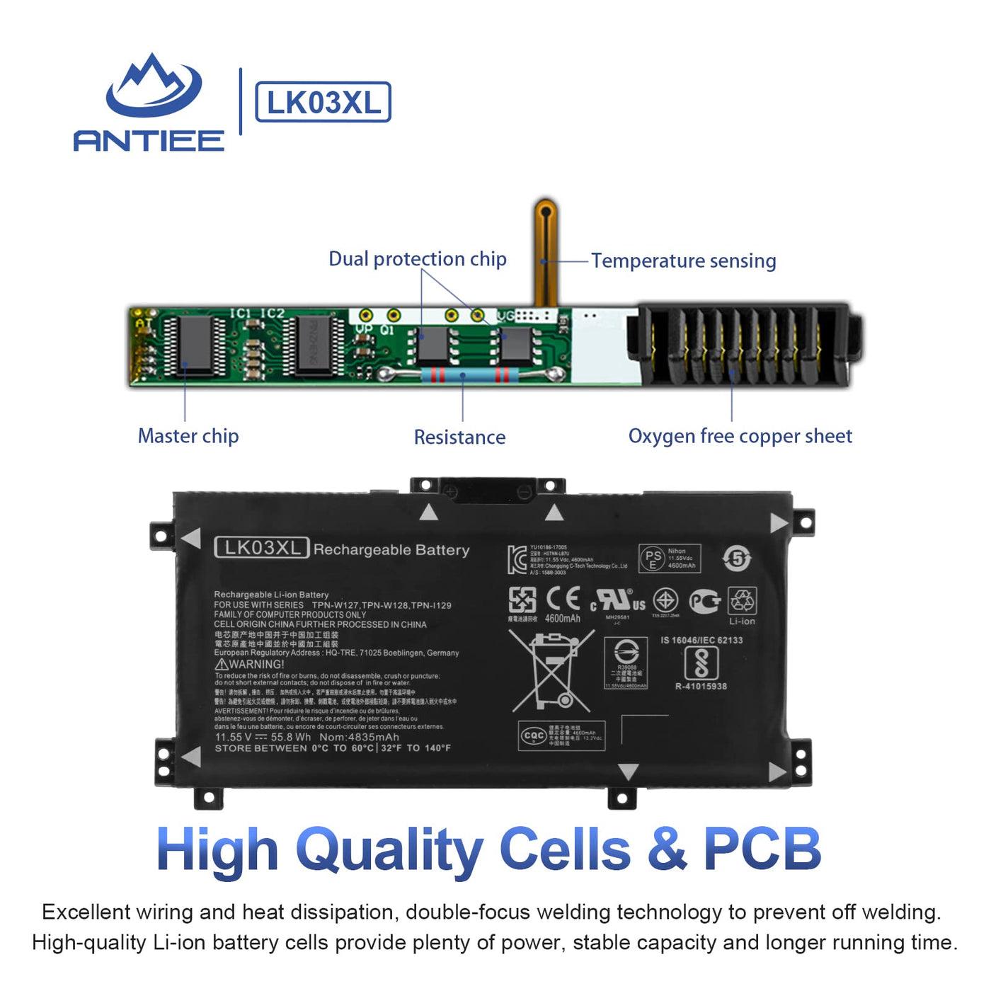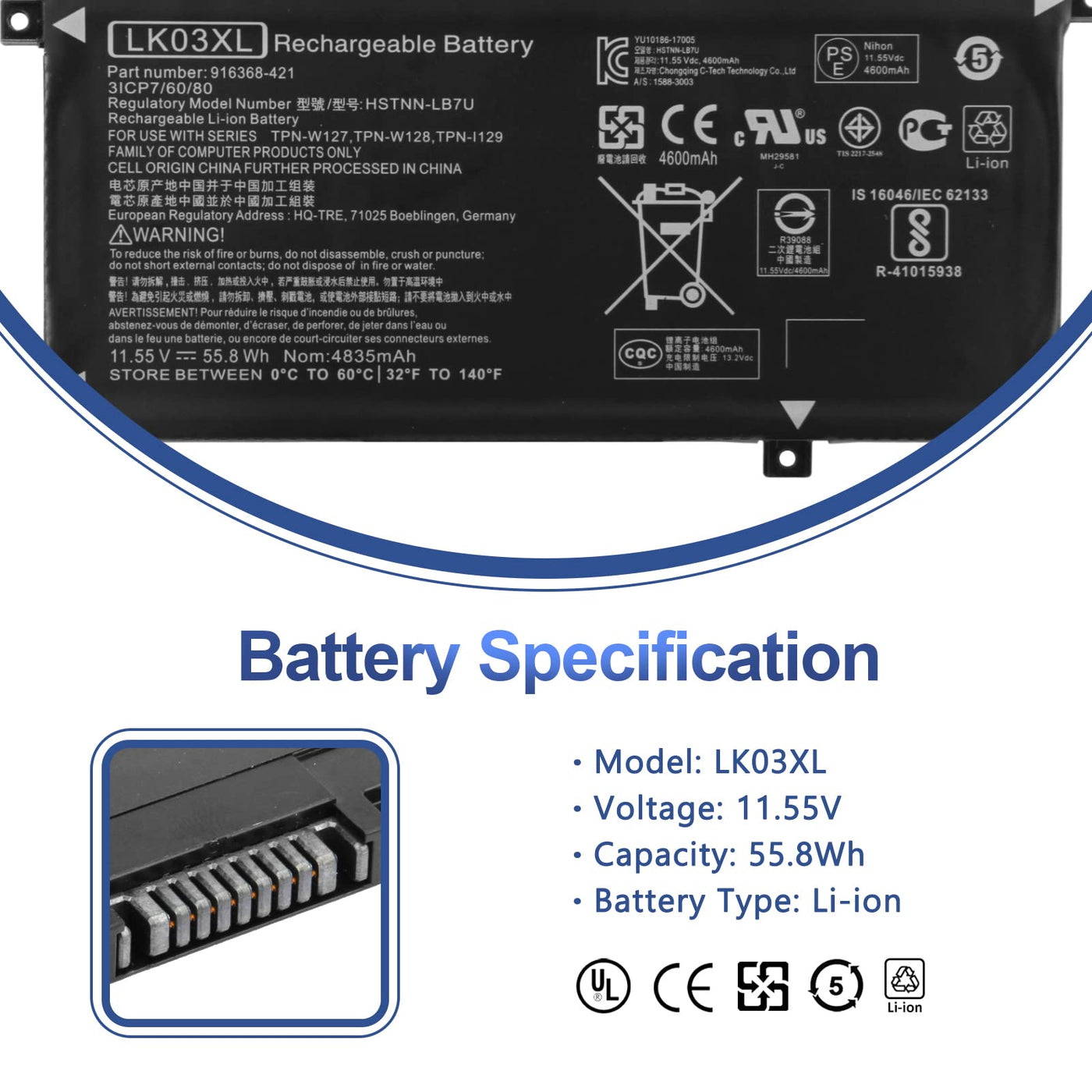 Battery Condition: Brand New Battery Type: Li-Ion Voltage:1155V Capacity:558Wh 4835Mah Support: 24 X 7 Email Support, Rest Assured With 30 Days Refund, 12 Months Replacement Condition: 100 New From Manufacturer, Grade A Cell Replacement For Part Number: Lk03Xl Lko3Xl Lk03048Xl Lk03055Xl Lk03052Xl 916368-421 916368-541 916814-855 Hstnn-Lb7U Hstnn-Lb8J Hstnn-Ub71 Hstnn-Ub7I Hstnn-Ib8N Hstnn-Ib8V L08855-856 L08934-1B1 L09281-855 L08934-2C1 L09049-1B1 L09280-855 L09911-141 L09911-421 L09911-1B1 Tpn-W127 Tpn-W128 Tpn-I129