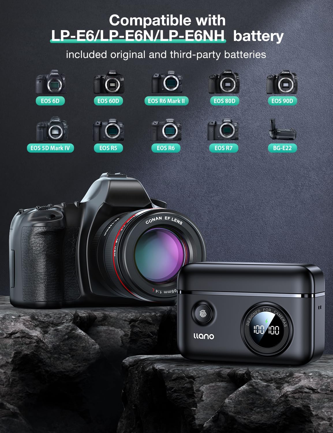 Q: What cameras are compatible with the llano LP-E6NH batteries and charger?A: The llano LP-E6NH batteries and charger are compatible with a wide range of Canon cameras, including the EOS R series (R5, R5 C, R6 Mark II), EOS 5D series (Mark II, III, IV), EOS 6D series (Mark II), EOS 7D series (Mark II), EOS 60D, 70D, 80D, and 90D, among others.