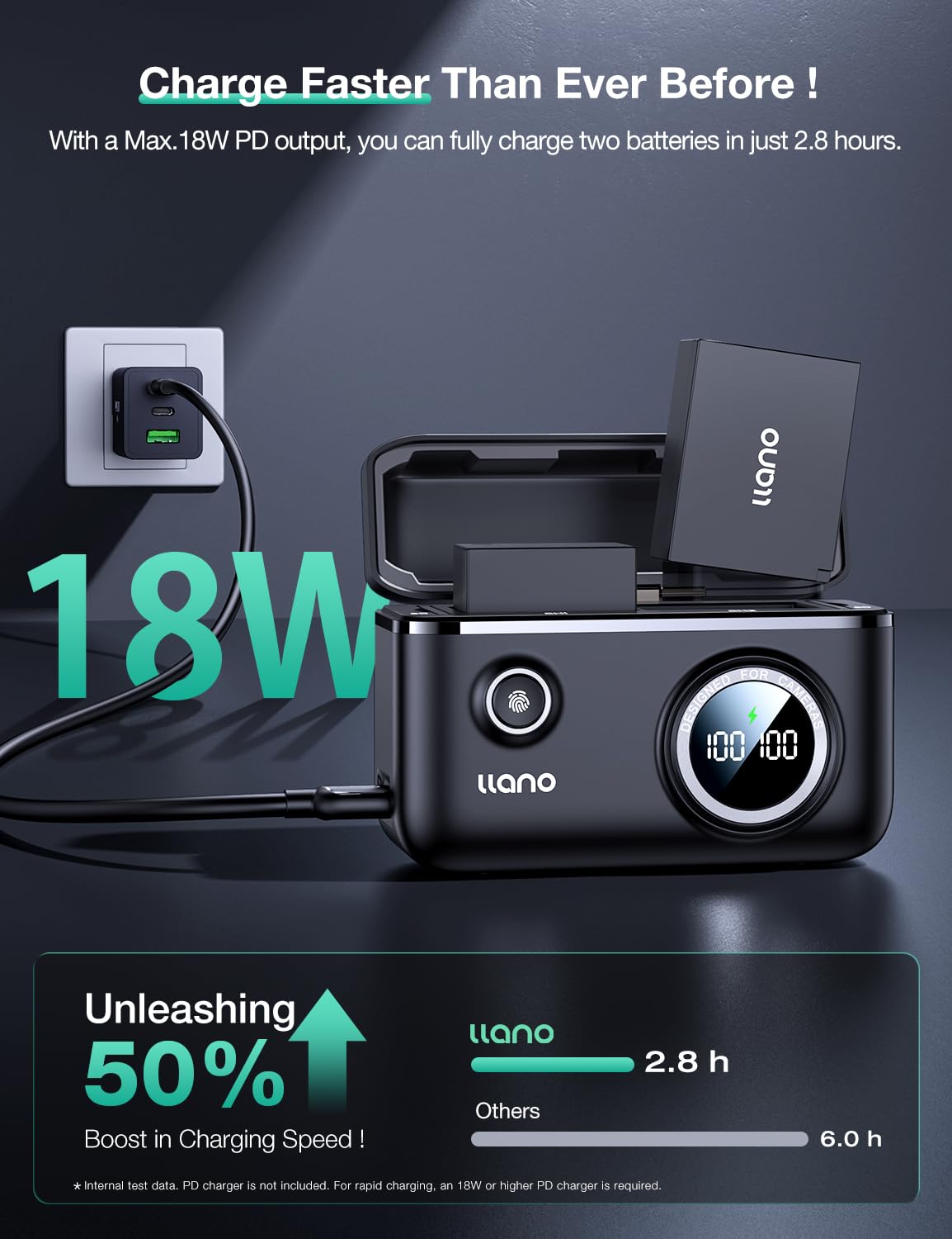 Q: How fast does the llano dual battery charger charge the NP-W126S batteries?A: The llano dual battery charger features 18W fast charging capabilities utilizing QC3.0 and PD3.0 technology, allowing you to quickly recharge each NP-W126S battery in a fraction of the time compared to standard chargers. This means you can spend less time waiting and more time capturing your moments.